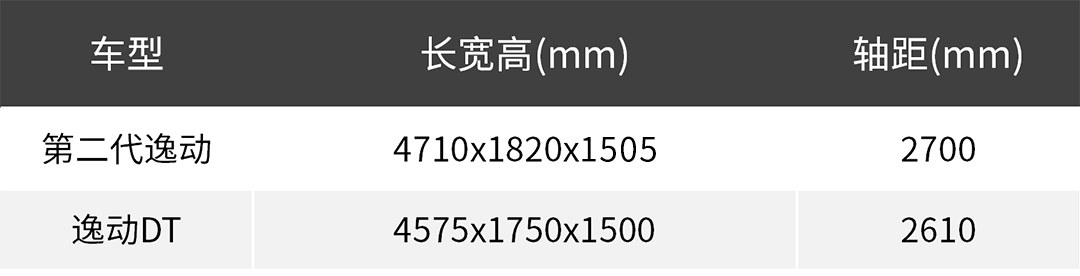 第二代逸动的长宽高分别为4710mm/1820mm/1505mm,轴距为2700mm。比起现款车型,长度和轴距都有增加,令整车看起来更修长时尚。另一方面,逸动DT车长宽高分别为4575mm/1750mm/1500mm,轴距为2610mm,从车身尺寸也可以看出逸动DT的定位会比逸动更低。