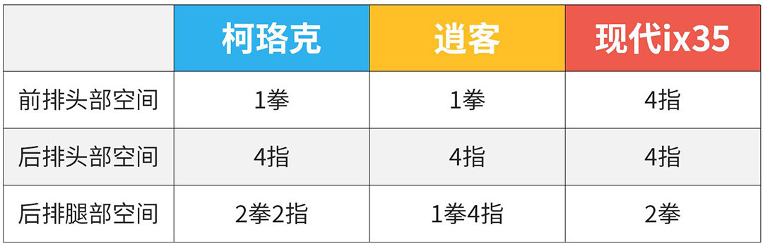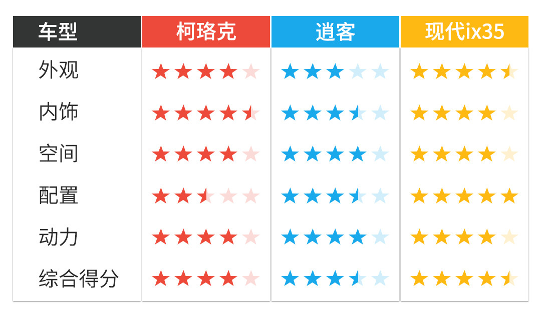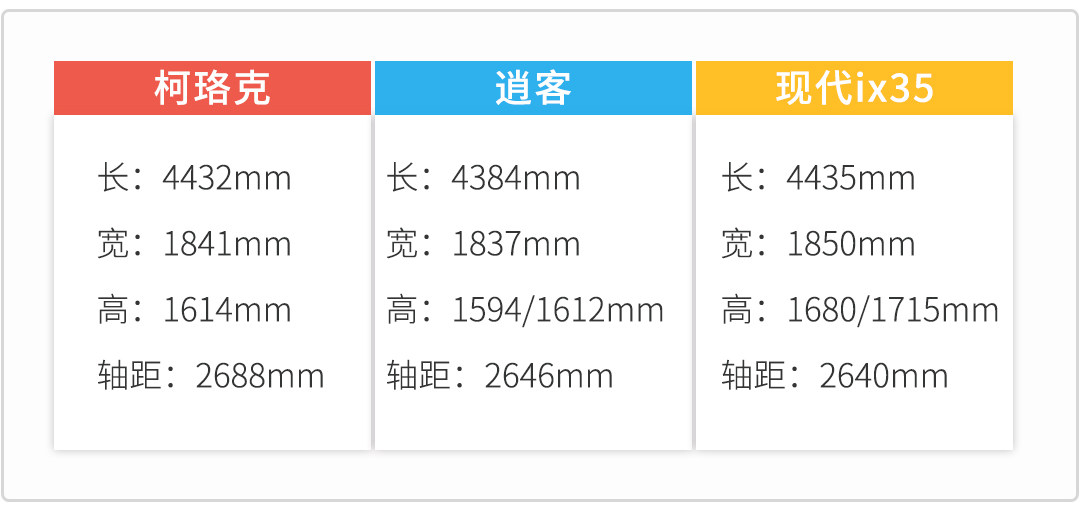 尺寸方面,3款车型的差距不大,都是这个级别中规中矩的水平。整体车身尺寸,现代ix35更有优势,针对轴距的话,柯珞克也有一定优势。至于具体空间表现,还是需要通过实测进行对比。
