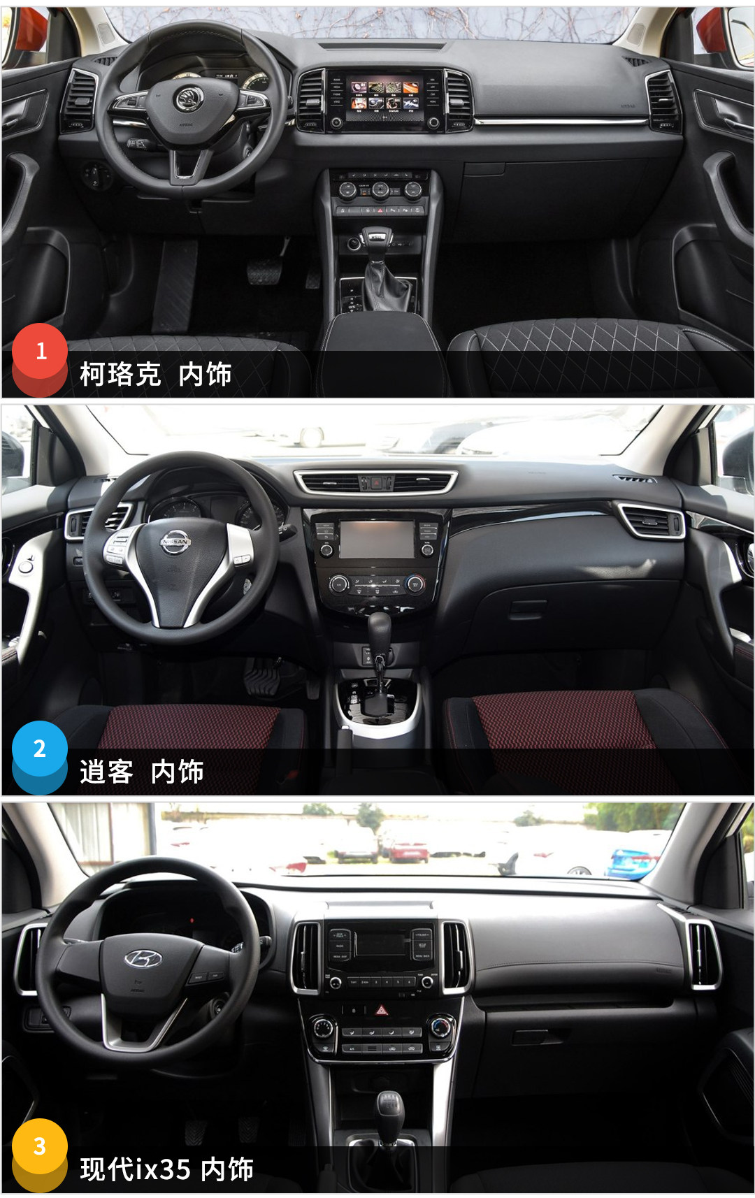 现代ix35的内饰设计也算跟得上时代,毕竟也是刚改款不久的车型,中控台层次分明,空调出风口等细节也做得不错,但整体材质用料中规中矩,体现不出什么档次感。所以如要排名的话,我个人认为是:1.柯珞克 2.现代ix35 3.逍客。