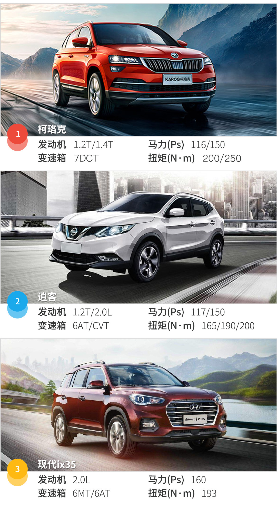 动力方面,柯珞克的1.4T车型、逍客的2.0L和现代ix35的2.0L车型为对标车型,参数都比较接近,但实际开起来各有差异。