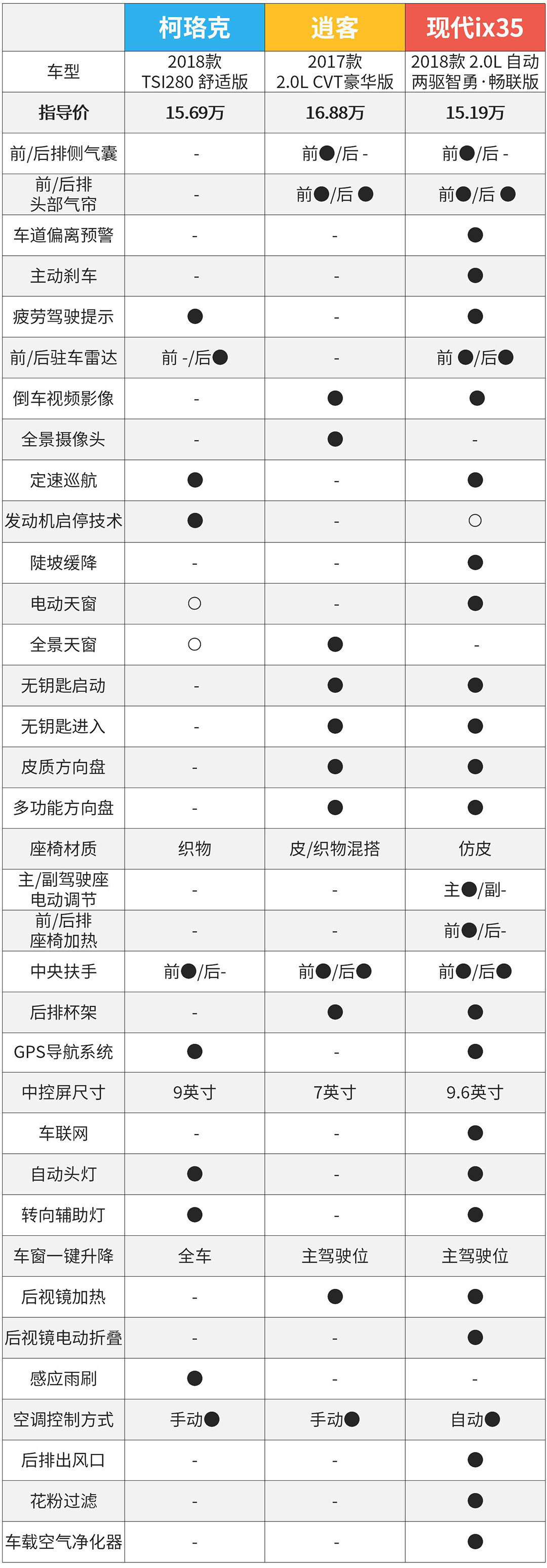 我们通过3款价格(包括终端优惠)比较接近的车型进行配置对比,现代ix35一马当先,无论是安全配备,还是实用性配置上都有明显的优势,接着就是逍客的配置更吸引人。柯珞克却表现得比较一般,而且跟现代ix35在配置上差距真的不少,价格还更贵一点。