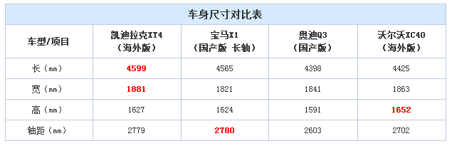 尺寸方面,凯迪拉克XT4的长宽高数据分别为4599/1881/1627mm,轴距为2779mm。这一数据表现在豪华品牌紧凑型SUV车型中可以说有着不小的优势,比奔驰GLA、奥迪Q3以及沃尔沃XC40这些在4.3-4.4米范围的标准轴距版车型大上不少,甚至要比国产加长后的宝马X1(4565mm)来的更长,轴距则与加长后的宝马X1只相差1毫米。同时它1881mm的车宽也可谓是有一定优势。因此,就身材比例来说,凯迪拉克XT4在这个细分市场中绝对算得上是“大块头”。