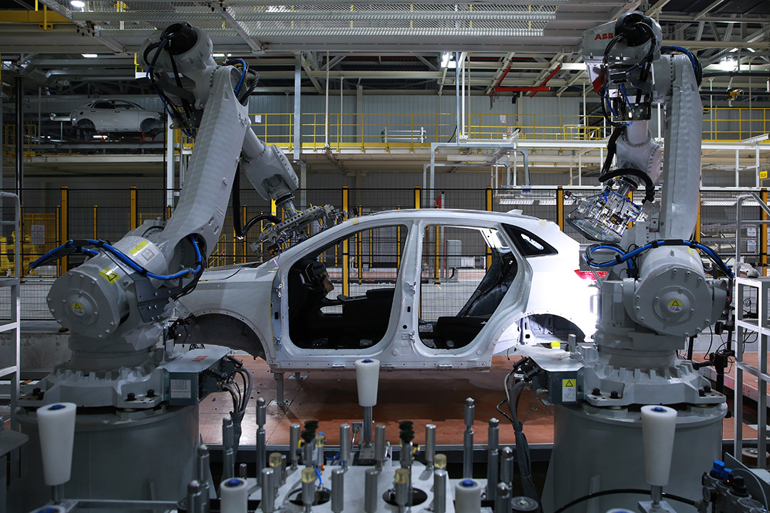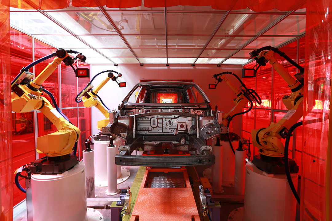 远不止此,车身车间目前配备了过百台日本发那科工业机器人,能实现自适应焊接、具备柔性化滚边和多车型切换生产能力,实现车间主线100%自动化生产的壮举。