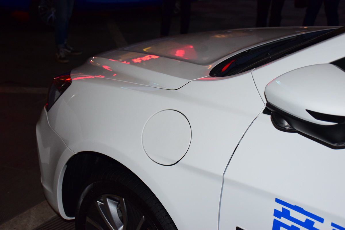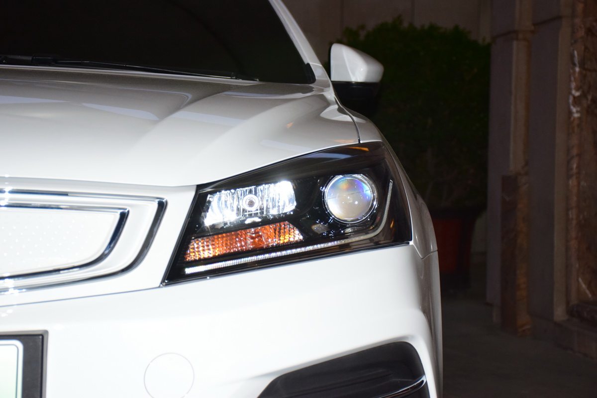 帝豪EV450的大灯造型有细微的调整,远光灯与近光灯的灯源还是用卤素大灯。