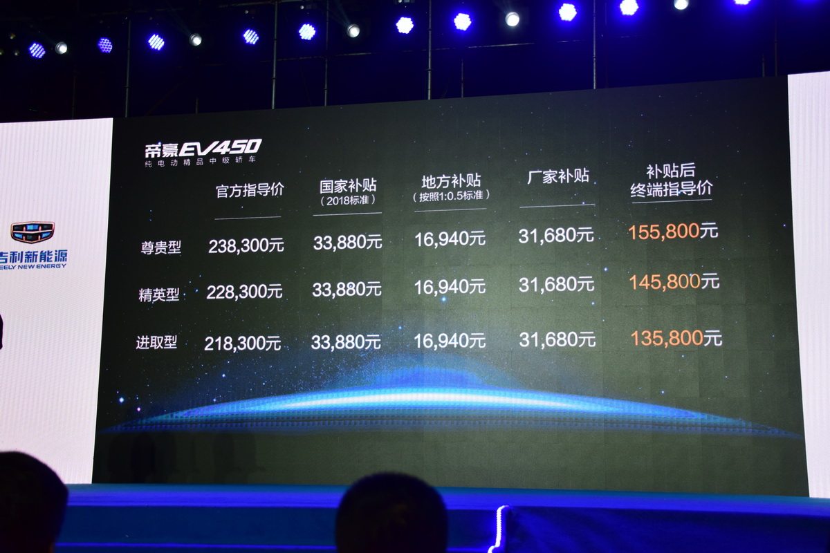 3月29日,吉利旗下的紧凑型纯电动车帝豪EV450正式上市,终端售价为13.58-15.58万。另有一款帝豪EV350同时上市,终端售价为12.58-13.58万。帝豪EV450是现款车型帝豪EV300的升级版。其标准续航里程为400公里,在时60公里/小时匀速行驶时,巡航里程可达450公里。