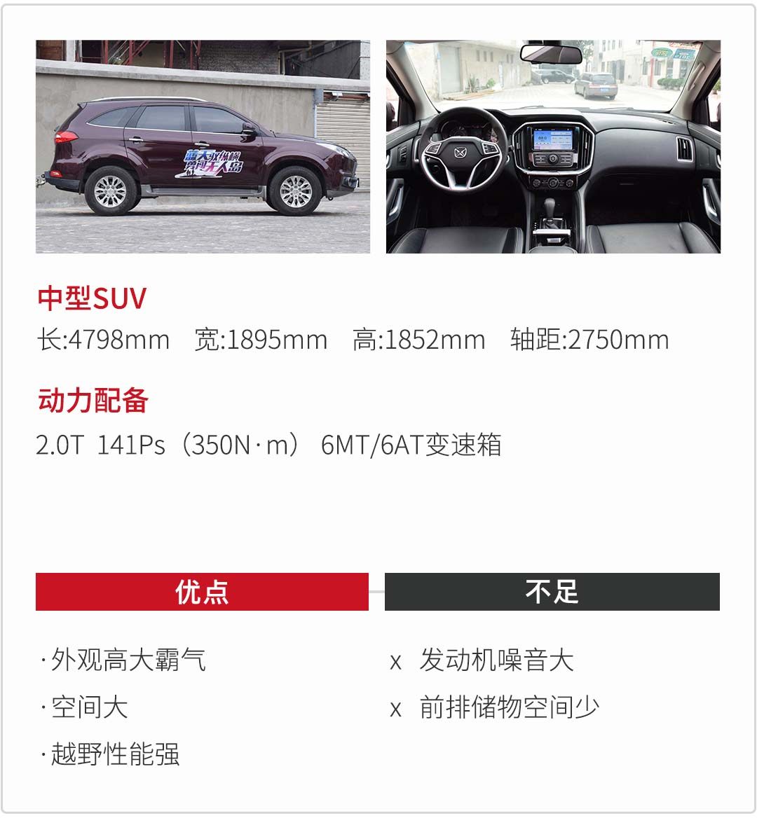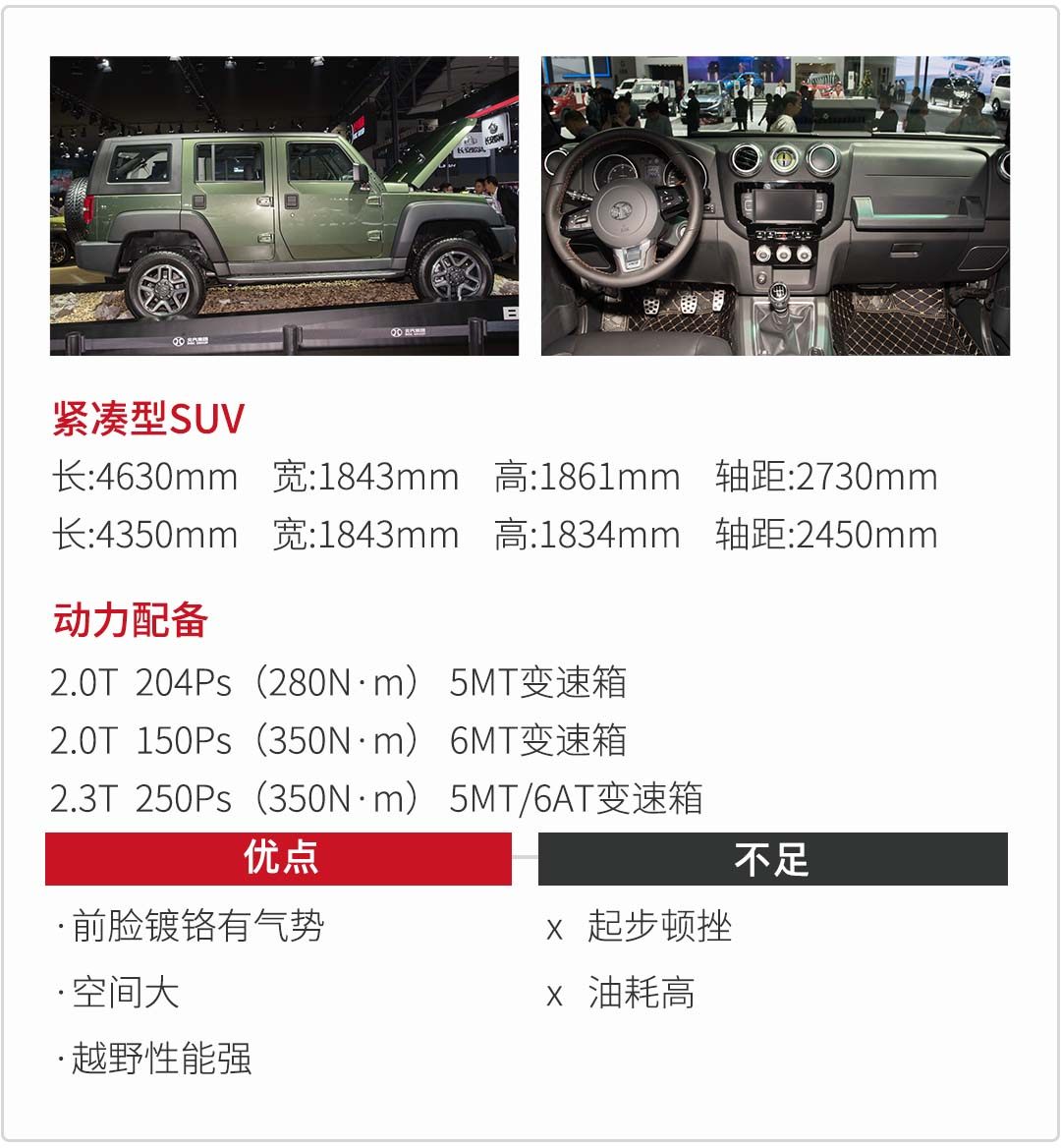 动力充足,标配分时四驱和分动箱,符合硬派越野的基本要求。外观方方正正,因此风噪同时也会大,内饰用料一般,硬塑料较多。副驾前方有一个硕大的握把,跟牧马人,奔驰G级设计风格相同。
