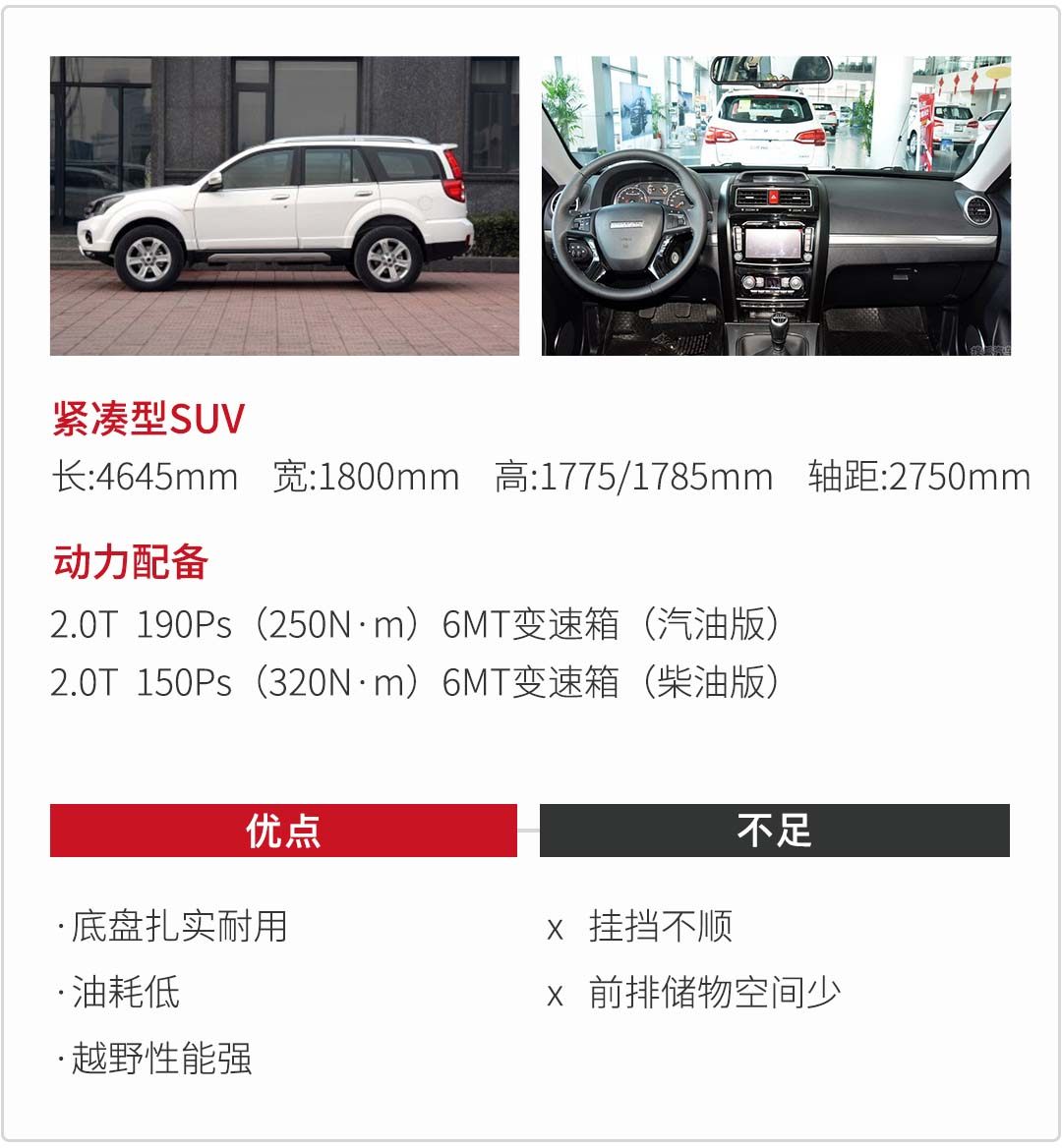 相比一般舒适的城市SUV,哈弗H5多了几分硬朗的设计风格,内饰做工用料不错,配置丰富(侧气囊、膝部气囊、胎压监控、上坡辅助、陡坡缓降等)。带后桥差速锁,越野性能大大提高。