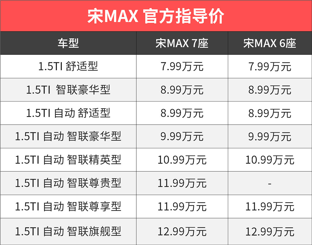 作为对10万级家用MPV市场触觉最为敏锐的企业,比亚迪在宋MAX 7座版月销持续破万后,乘势加推6座版,推出2种动力组合共7款车型,售价7.99万—12.99万元,7座版同步新增2款高配车型: