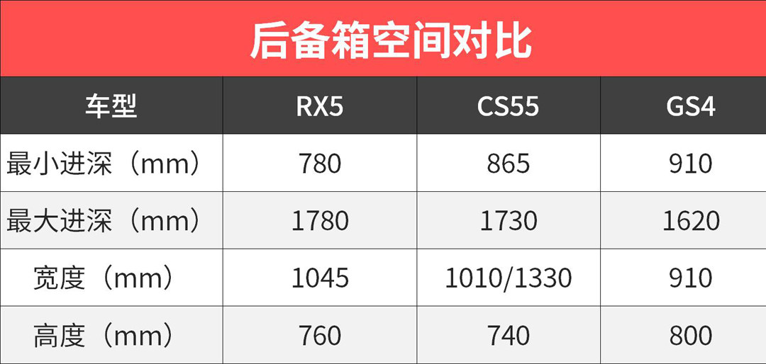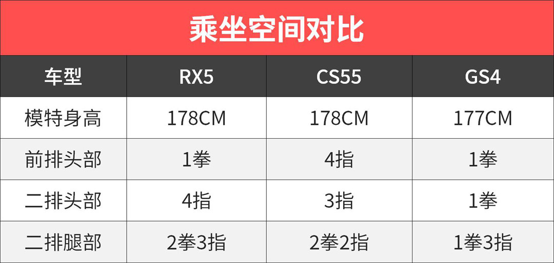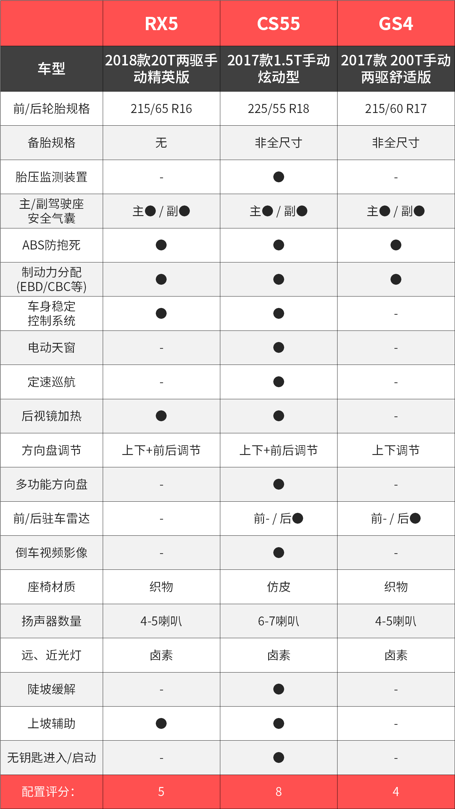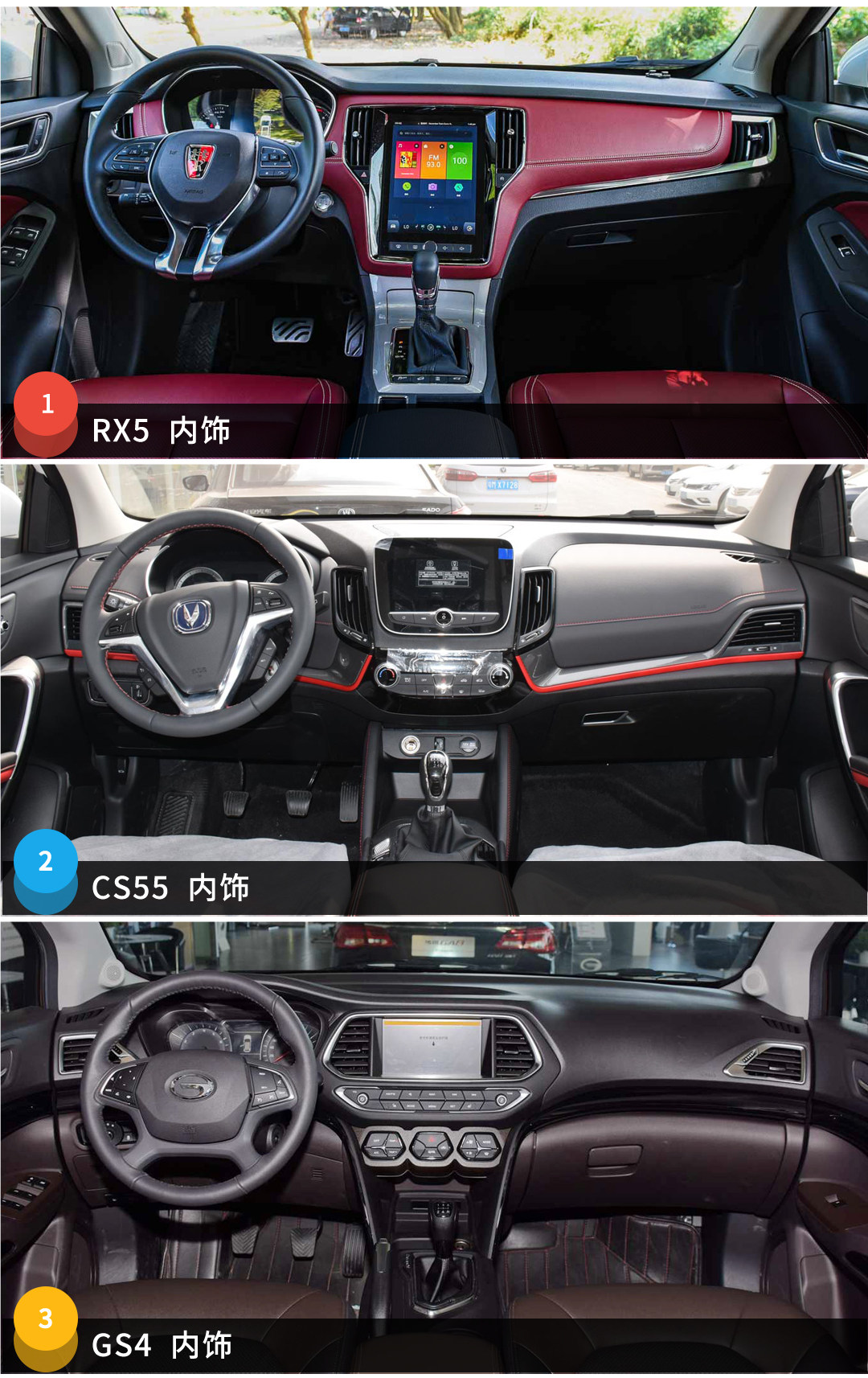 内饰风格也是各有特点,RX5是非常标准的T字型布局,中高配以上配备的大尺寸多功能显示屏是亮点;CS55内饰相比外观原创度更高,层次感十足,整体所营造的运动氛围也是三车中最强的;GS4内饰中规中矩,各功能分区明确,以实用性为主;另外,三款车的做工用料都不用担心,在同级中都名列前茅。