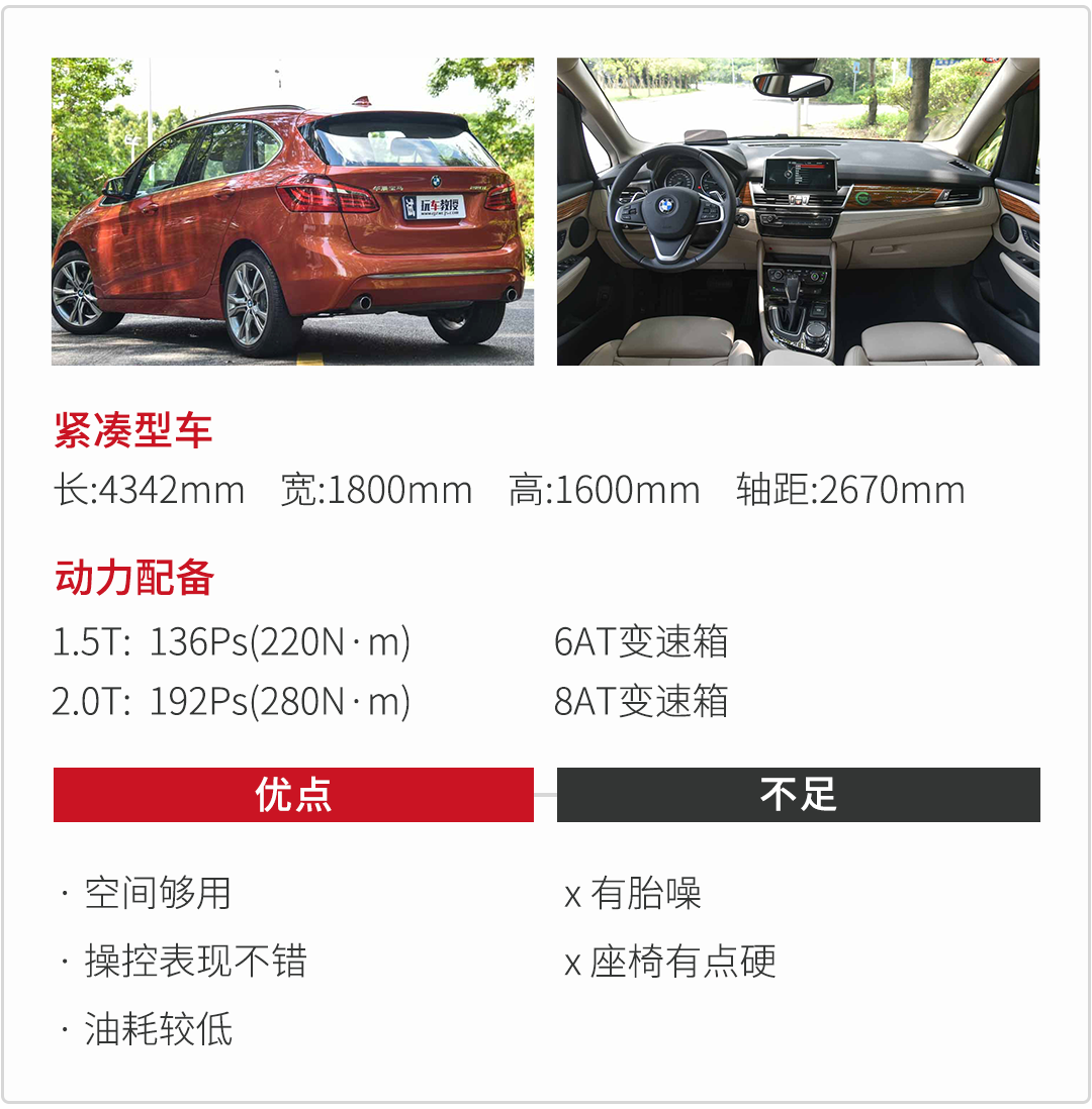宝马2系的旅行车在宝马家族里面是个比较特别的存在,一开始又是前驱又是三缸,很多人都不看好,但是事实是宝马做前驱又做三缸的不止这一款,而且还卖得不错,而且如果你想要一辆适合小两口去玩去旅游的精品小车,豪华品牌就只有奔驰B级和这里2系旅行车了。