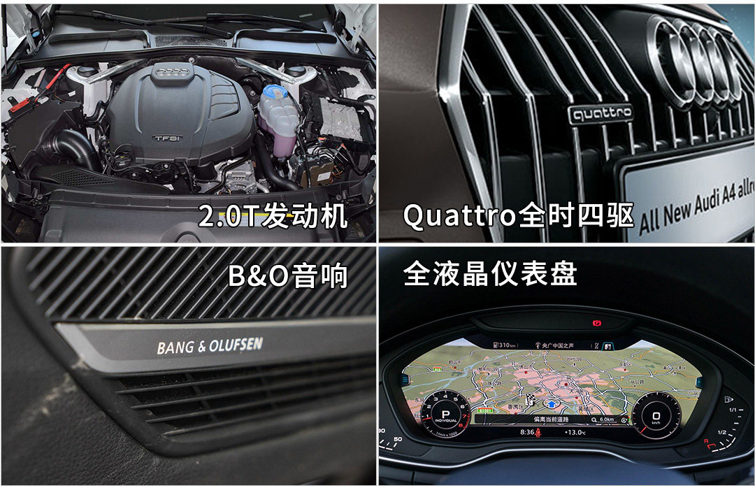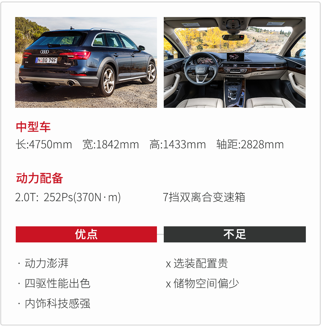 这款车其实就是加高兼高配的A4,而且高达40多万的售价,所以它无论是性能还是配置都比较高的,首先2.0T发动机252马力,加Quattro全是四驱,百公里加速6秒不到,动力强抓地稳,陡坡缓降、上坡辅助,玩点轻度越野完全OK;配置就不用担心了,自动泊车、座椅加热、B&O音响都有,开去旅游足够,同时选装项多,而且也不便宜,这也是奥迪一贯的特性,毕竟豪华品牌,想多享受就得多掏钱。
