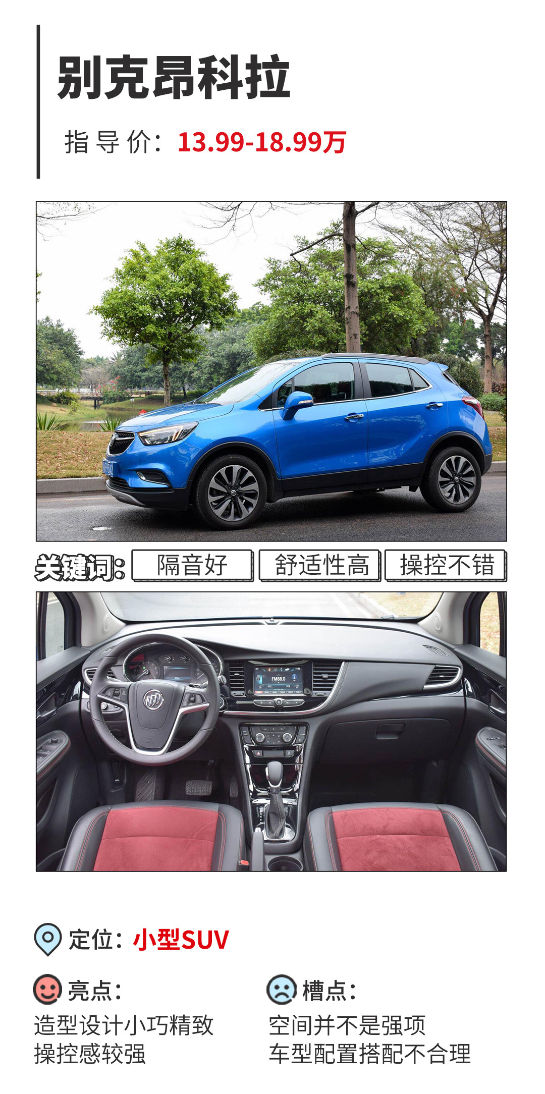 教授辣评:对于昂科拉来说,小巧可爱的身形符合到它城市SUV的定位,当然,空间小是昂科拉的短板,对于很多小资家庭而言,拥有这样一台小车足够使用,如果对空间有着极高要求的朋友,建议还是考虑其他车型。