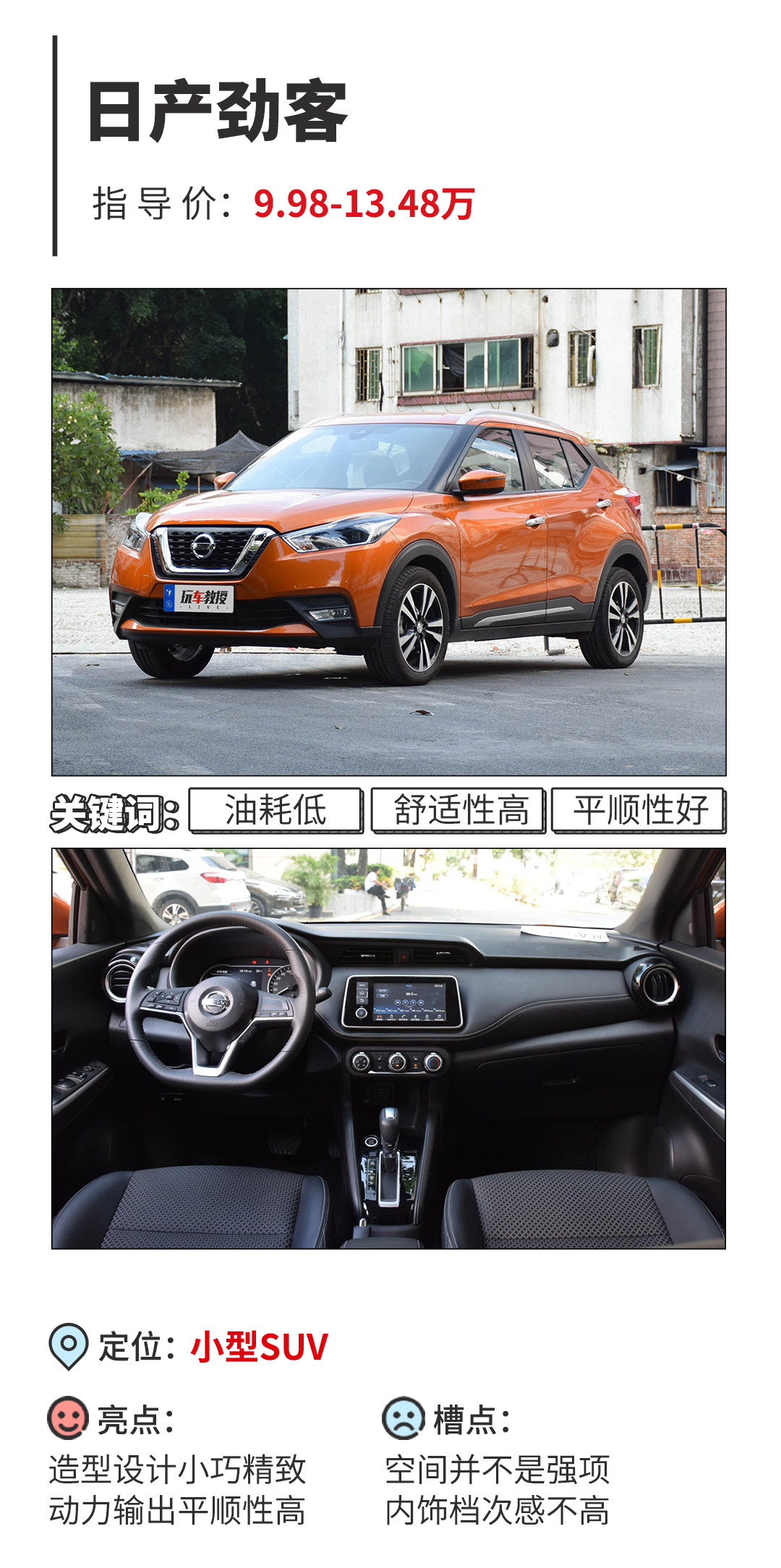 教授辣评:对于劲客而言,作为日产旗下最新的一款SUV车型,无论在质量还是在油耗方面,我们也不需要过多的担心的,而且对比起同价位的竞品选手,它在配置上也是占据着一定的优势。