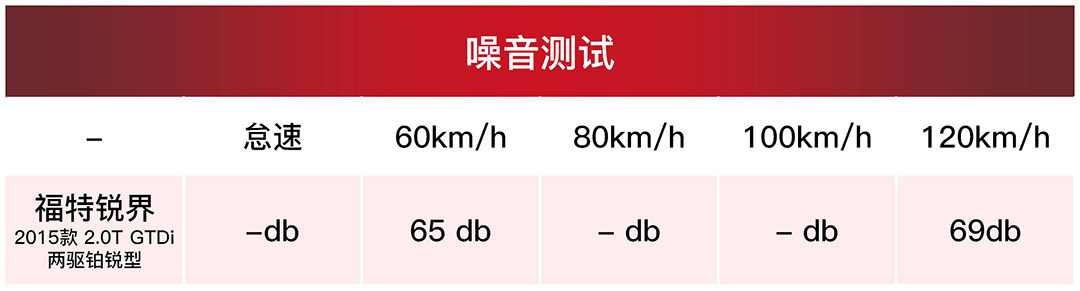 隔音方面,锐界的表现也不算差。60公里时速行驶噪音为65db,120公里时速行驶噪音为69db,分别并不大。在这次横评的8款车型里面,60公里时速噪音数据锐界属于中游,而120公里时速锐界的噪音值则最低。可见锐界对风噪、路噪隔绝方面都做得比其他车型更好,而噪音大部分都是来自于发动机,。