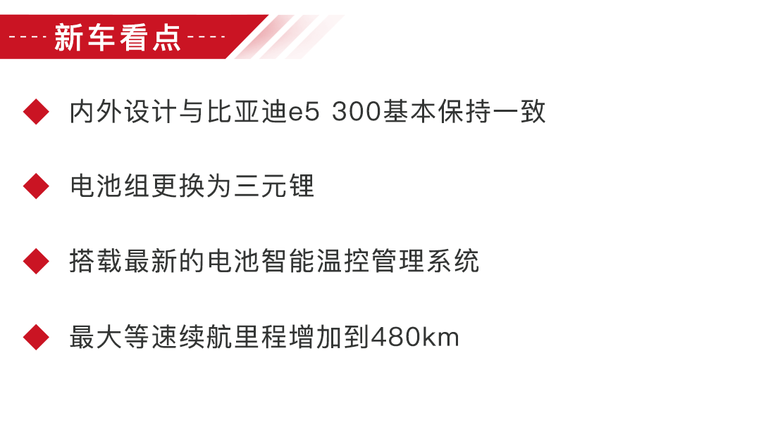 同为纯电动紧凑型车,比亚迪e5 450的整体风格更偏家用。它的外观、内饰造型都与比亚迪e5 300保持着高度的一致,朴实且简约。OK,这都不是重点,其实我们看名字也知道比亚迪e5 450这次最大的提升在于续航里程。e5 450也换装上了密度更大的三元锂动力电池组,等速工况下的续航里程提升为480km。同时,充电功率也提升至60kW,进一步缩短了充电时间。这次提升的效果看上去的确不赖啊~