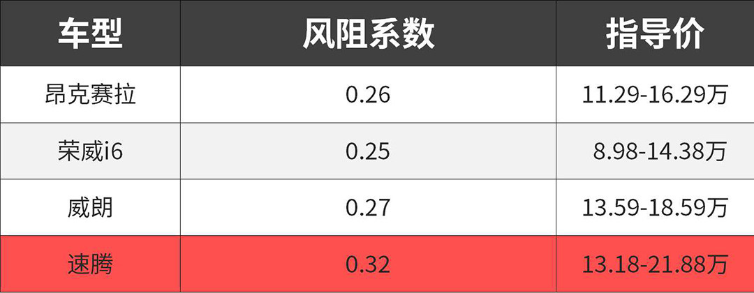 这里看速腾的数据是最差的,但是速腾在德系车里仍属于风阻系数低的行列。从产品层面来看,速腾成熟的动力系统、底盘调校以及舒适性在同级车里依旧是佼佼者,对得起它的口碑和销量。
