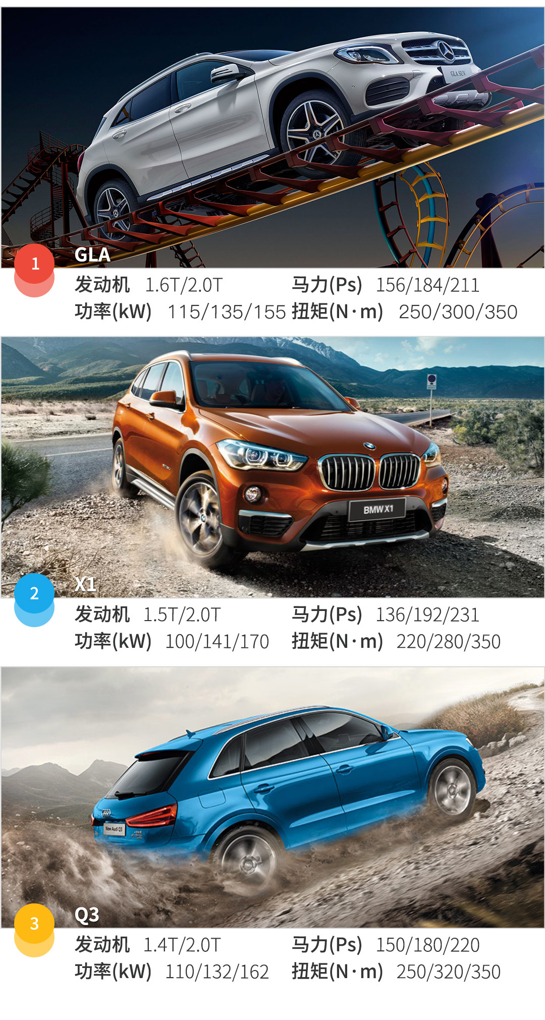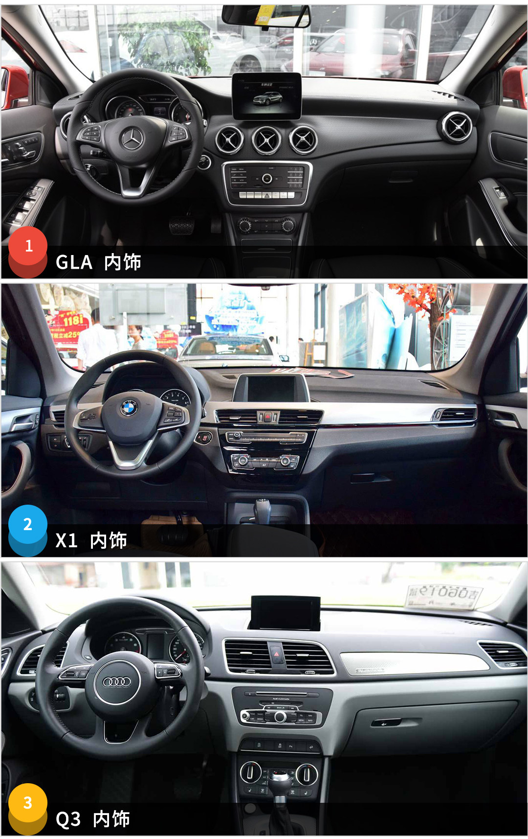 GLA最大的卖点在于内饰和外观的设计,这一代奔驰的外观和内饰设计无论在哪个级别都是顶尖的存在;宝马X1的亮点在于中国消费者最看重的空间,特别是后排,拥有同级别最大的乘坐空间,凭借这个卖点俘获不少消费者;Q3的驾驶感受轻松,是一辆适合女生日常驾驶的车辆,缺点在于内饰设计实在是跟不上时代。