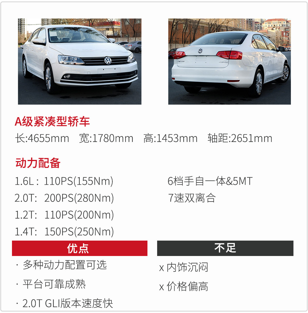 速腾的配置表的配置简直五花八门,各种动力总成从1.6L到1.2T、1.4T甚至连2.0T的GLI版都有,给了我们更好的偏向性选择。追求实用我们可以选择适可而止的版本,假若追求动力我们也可以选择GLI,TSI+DSG的组合绝对不会让你失望,不得不说大众此举非常聪明!但同等配置下价格算是偏贵。