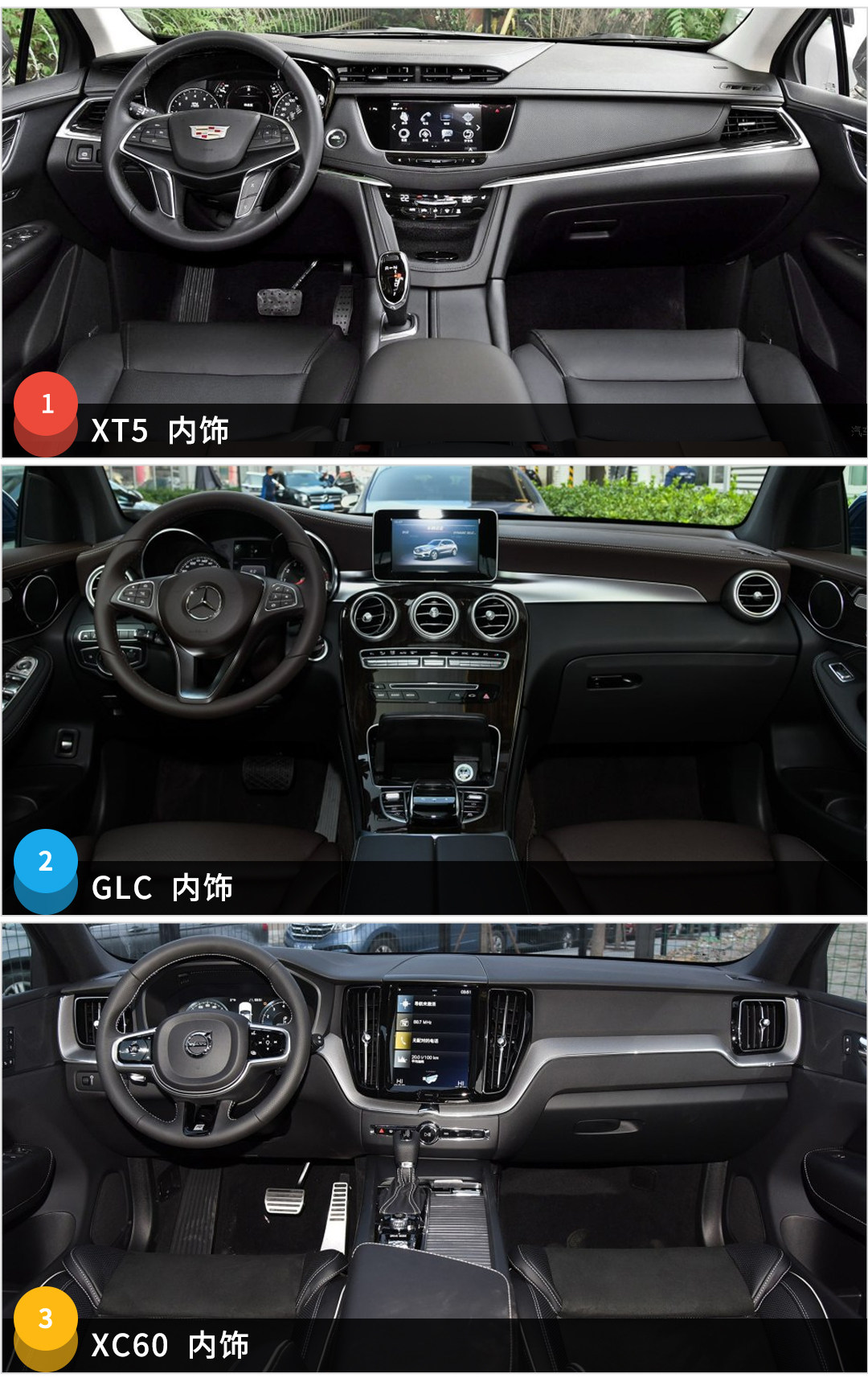 三款车的内饰设计都很棒,XT5和XC60的内饰用料高级,触感好,营造了不错的豪华感;GLC设计感出众,材质柔软,气氛轻松。但总的来说三款车的设计风格还是截然不同的,XT5展现的是粗犷前卫,大量的横直线条和棱角设计带来不错的视觉冲击效果;XC60则采用以简洁,时尚为主的北欧设计风格,配以实用性不错的科技产品,展现出更多的是不错的居家感;而GLC走的就是奔驰一贯的风格,既典雅又细腻,营造出豪华的气氛同时更为轻松舒缓,但是给人的设计感在三款车中依然显得比较惊艳。