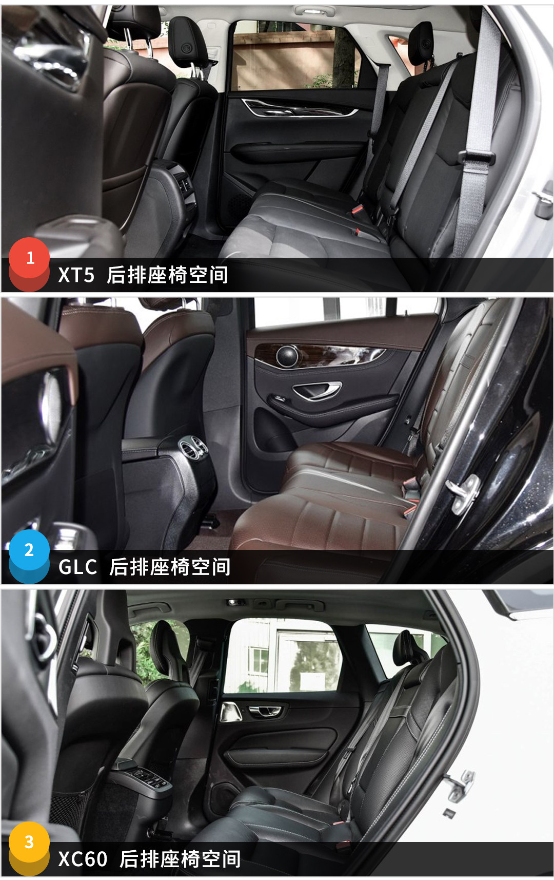 由数据我们可以看出,在车身尺寸方面,XC60比起其他两款车型,占有比较大的优势。至于空间,将前排座椅调到最低,三款车的前排头部空间都很宽裕,视野性也都比较好;而到了后排的腿部空间,xc60 的表现就要比GLC和XT5优秀一点,要稍微富裕一些。再看头部空间,三者的表现也不错,对于满足大部分人的需求是没有问题的。