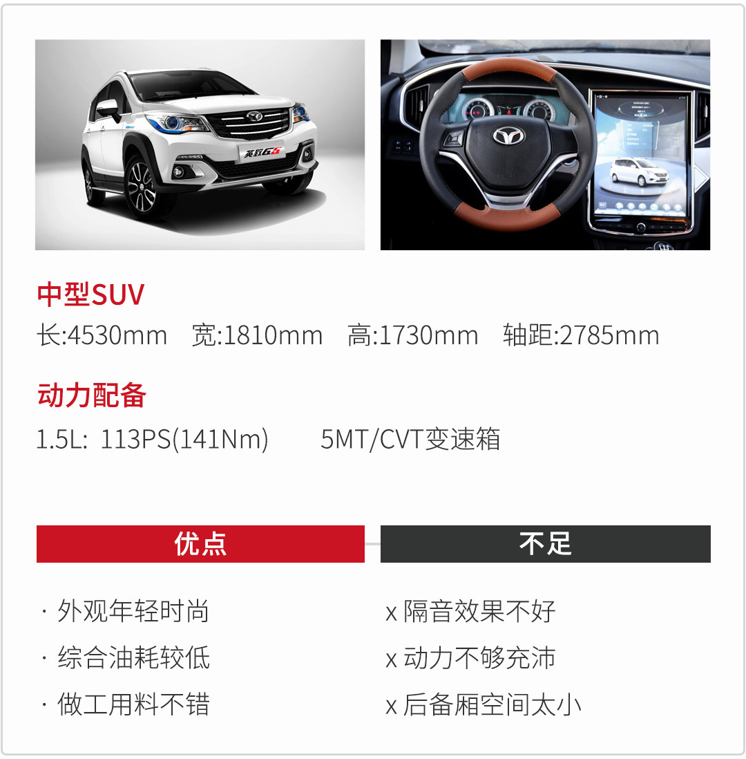 G5的内饰材质用料不错,舒适感尚好,16英寸的中控大屏显得很有科技感;动力搭载的是1.5L自然吸气发动机,最大的输出动力是113PS,对于中型SUV而言,动力有点肉肉的,不够充沛。虽然G5的配置高,综合性价比也不错,售价还很实惠,但是由于品牌的知名度不高,以及前款车型G3的表现欠佳的影响,所受的关注度并不高。而面对的竞争对手又都是像长安CX70这些实力不俗的对手,与此同时所带来消费者选择的多样化,也增加了G5的竞争压力。