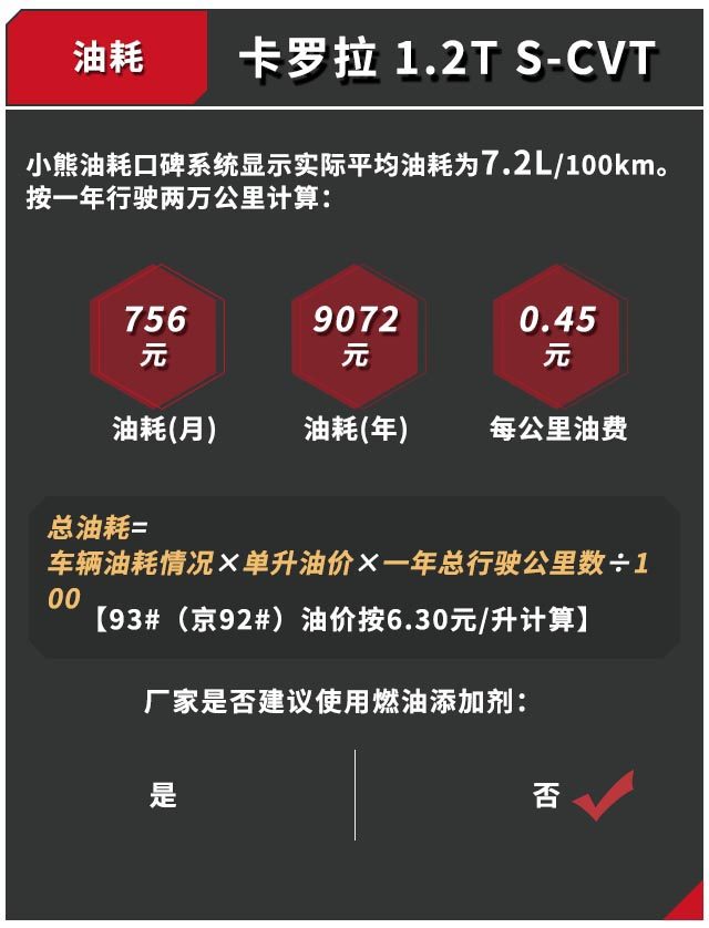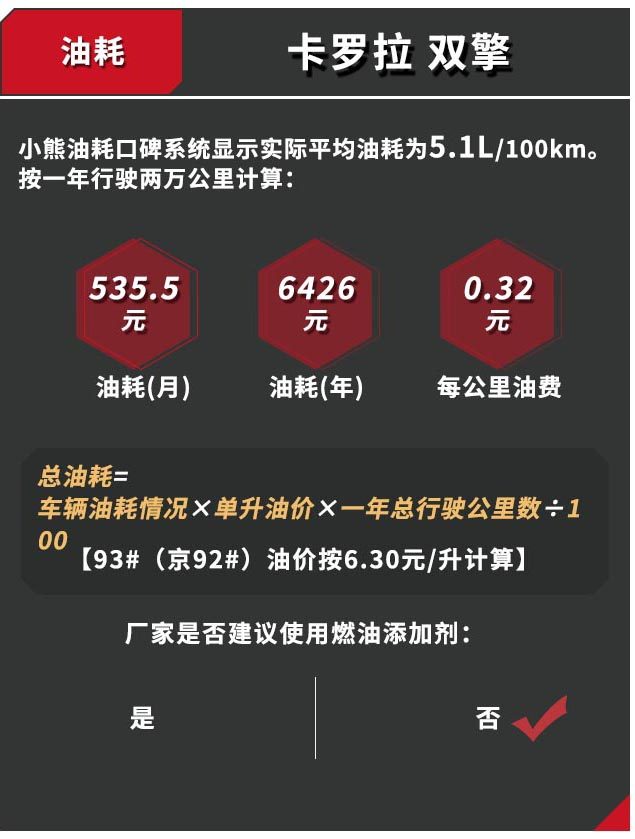 根据小熊油耗口碑系统数据得出,一年驾驶2万公里,计算得出卡罗拉比双擎一年油费多出2646元。