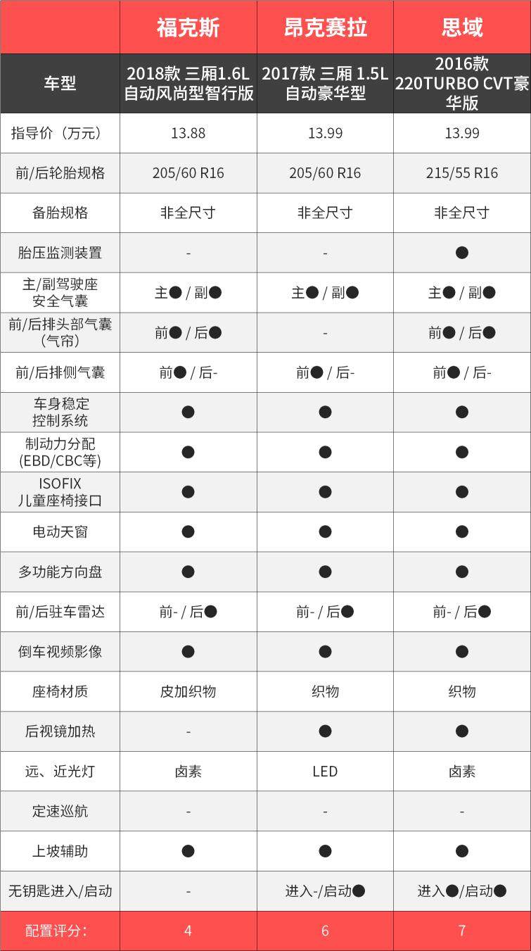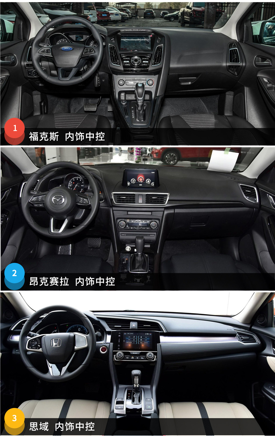 教授拿了三款相近价位的车型进行对比,可以看到思域的综合表现最佳,昂克赛拉表现处于三者之间,福克斯对配置还是比较吝啬的。