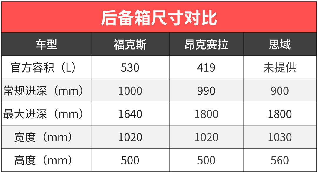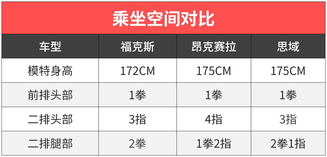 福克斯的空间表现一直不太突出,而轴距都是2700mm的昂克赛拉和思域在腿部空间表现上差异明显。