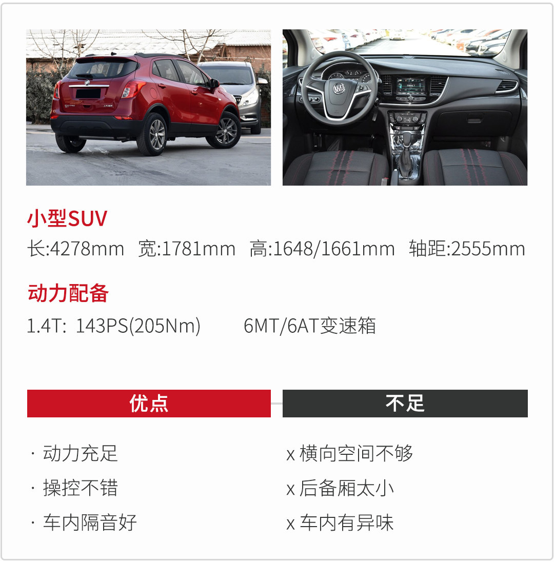 动力参数方面,昂科拉全系标配1.4T的发动机,143匹最大马力,205牛米最大扭矩,可以说是同级的拔尖水平了。还有就是内饰方面,无论是设计布局还是做工用料,都属于同级的上游水平,毕竟别克真的很懂中国消费者的需求。但昂科拉的缺点和优点一样明显的是它的空间表现,主要是后排和后备箱空间都非常一般。所以昂科拉只是定价贵了点,但有不错的优惠,就凭它是SUV,而且有这个动力水平,也算它值这个价吧。