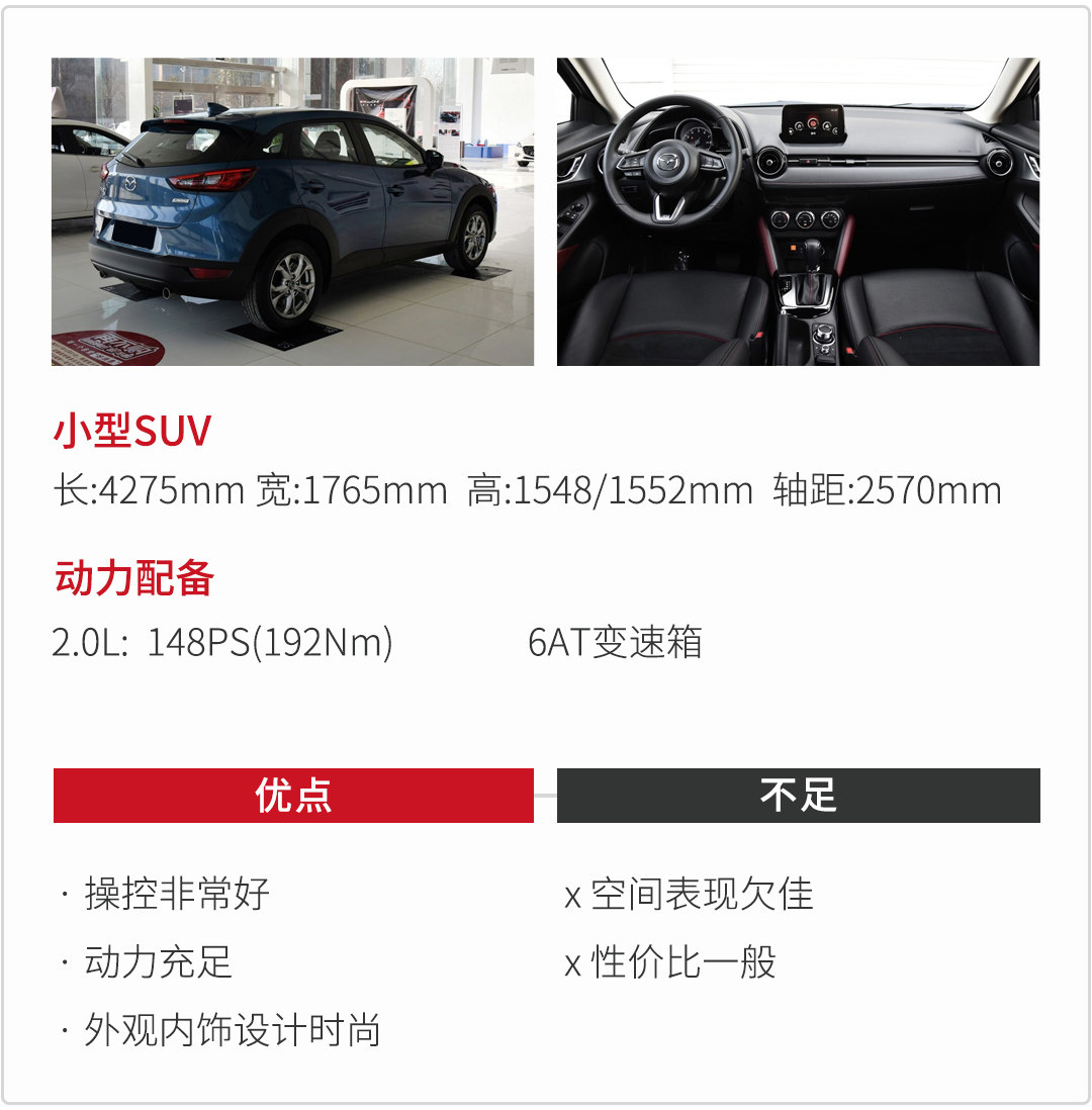 首先马自达CX-3同样也继承了马自达自家的三大卖点,分别是“魂动设计语言”、“创驰蓝天技术”和“精准的操控调校”。而且现款的马自达CX-3在内饰设计方面也做到了突破性的表现,比起马自达旗下的其它车型,CX-3的内饰显得十分抢眼。动力方面也是同级上游水平。综合各方面的表现,CX-3的确非常优秀,但是作为进口车型,始终都难谈上高性价比吧。