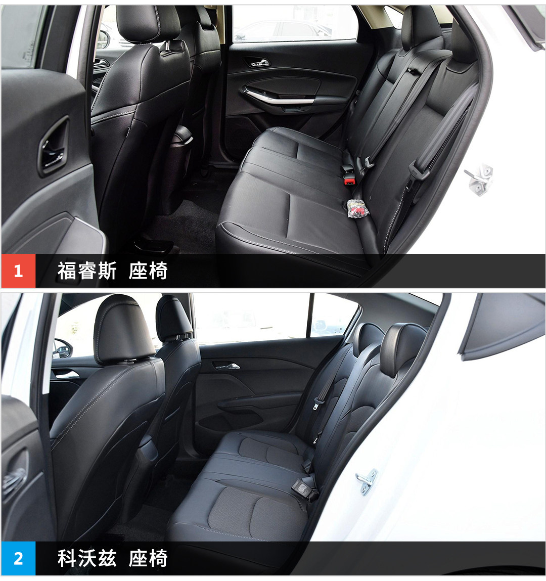两车座椅的乘坐感受都比较舒适,福睿斯的座椅更宽大,对身体的承托和支撑更好,而科沃兹的座椅看起来档次感更高,同时用料方面相比福睿斯更胜一筹。两车第二排都不带中央头枕,这是要吐槽的地方。两车的后排地台都有一定的凸起,科沃兹相对来说凸起高度较低,能更好照顾到中间乘客。