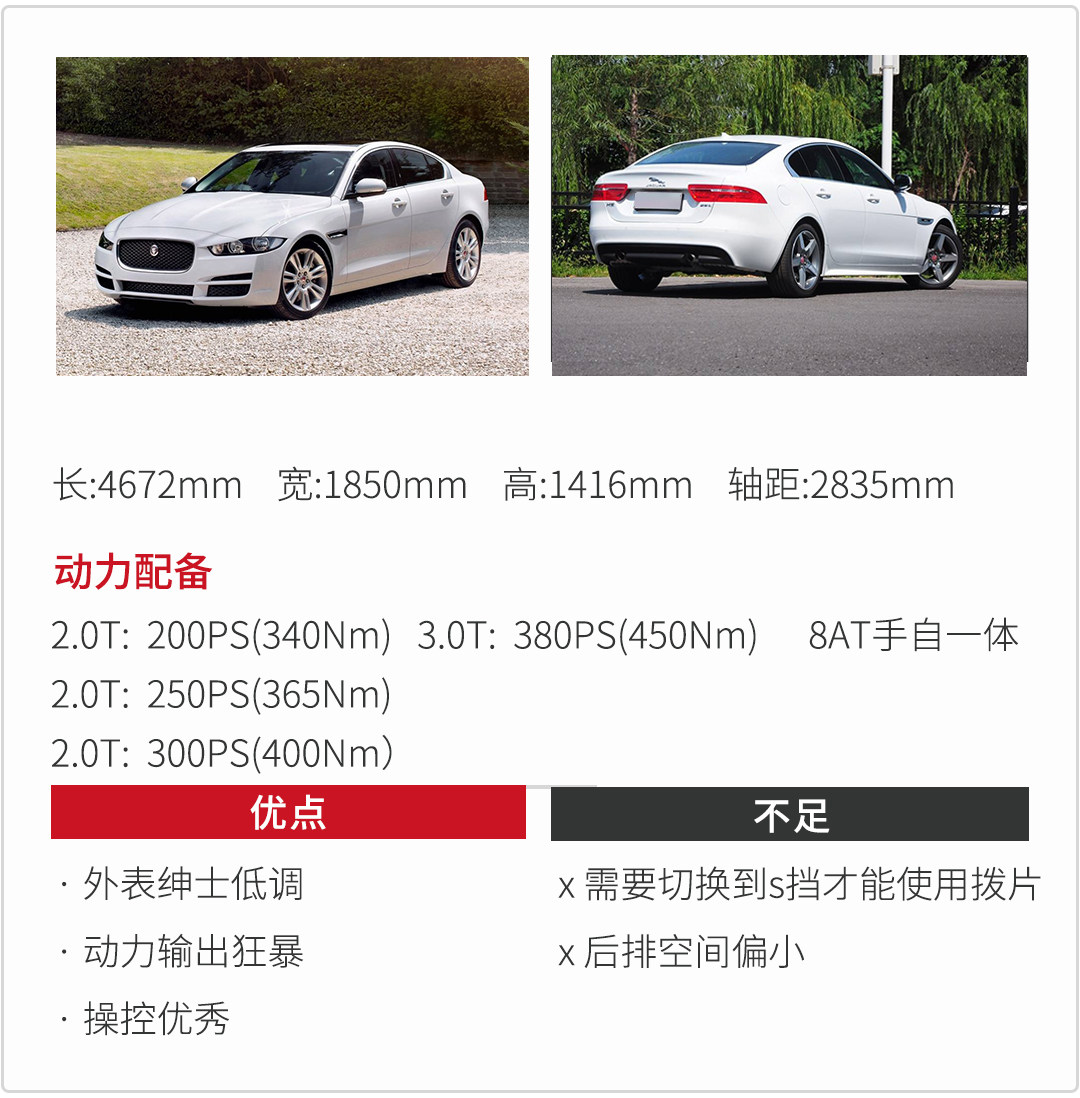 XE的底盘结实且非常之具有韧性!整个行驶质感比起宝马3系更有性能车的感觉,但高效的滤振使其舒适性也能保持在一个很高的水平,卓越非凡!它根据不同的需要配备了全时四驱跟前置后驱的版本,值得一提的是高功率3.0T版本采用的是F-type跑车的那副V6机械增压发动机,0-100km/h加速甚至比F-type 3.0T V6快上0.2秒,且拥有捷豹独有的男低音声浪,夫复何求呢?!
