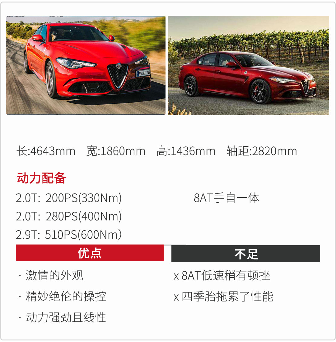 Giulia的操控绝对可以用无与伦比来形容,甚至可以“教训”宝马3系的地步。不但轻盈且异常精准,悬挂表现也是非常高级,保持路感的同时把不必要的小颠簸过滤掉。虽然采用涡轮增压发动机,但动力输出平顺的出线性你会不知不觉的就开得飞快,毫无违和感。除了低功率版本其余均可选配极限差速器,但因为不能关闭车身稳定系统的缘故,当我们想要激烈驾驶时就有那么一丢丢的遗憾了!配备四季胎虽然可以兼顾不同情况下的使用,然而这也成为了Giulia的累赘,但总的来说Giulia对于它的对手们依然是异常强大的存在!
