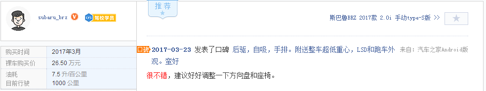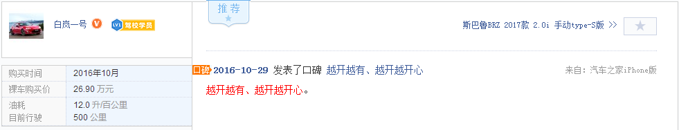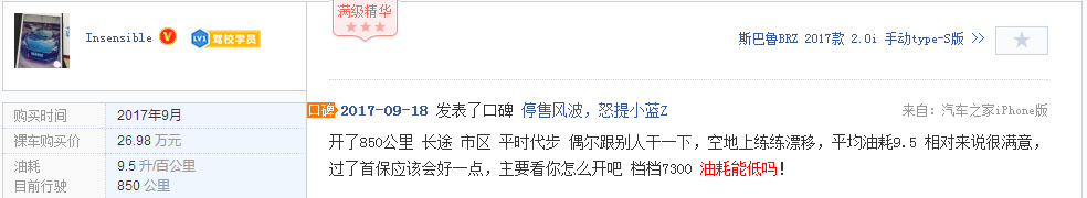 当习惯了“7200干他”,油耗高就也成了家常便饭,手动挡控口中那句“手动挡车一定比自动挡车省油”的话便不攻自破。除了为降低谋生成本的人被迫买手动挡外,几乎买手动挡的人都是为了情怀买单。玩车的欲望自然也不会低,逢车必超,见缝插针(排除一些安全驾驶的手动挡驾驶者)。以斯巴鲁BRZ真实车主为例(数据来自于汽车之家):