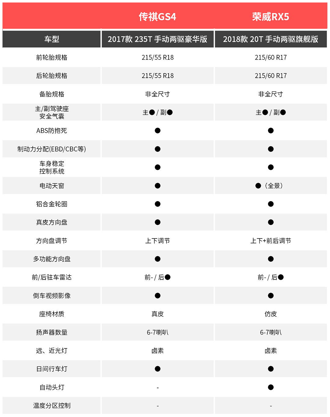 从配置表可以看到,这两款车的一些日常实用配置都会有,但是荣威RX5的配置还是比GS4的多不少,比如RX5的电动天窗是全景的,方向盘支持4向调节,再加上自动头灯,这些都是GS4都没有的,不过GS4却有真皮座椅,这在豪华感上有一定的提升。