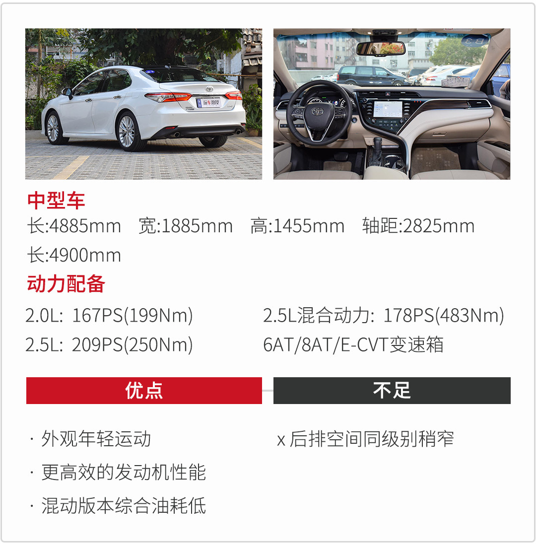 “老饼”在粤语里多指年纪大且油腻的人(多指中年以上的男人),第八代凯美瑞完全没了上一代留下来的“饼味”,在外观方面变得更加激进,并且还有一款更加犀利的运动版,在造型上照顾到一部分年轻消费者需求,回头率不低。在动力方便除了2.0L和2.5L两种自然吸气发动机外还提供混动车型,丰富的动力也是选择他的其中一个优势,特别说明一下,新凯美瑞采用的发动机整体热效率达到了41%,为目前世界第一最高(一般水平高5-6%)。