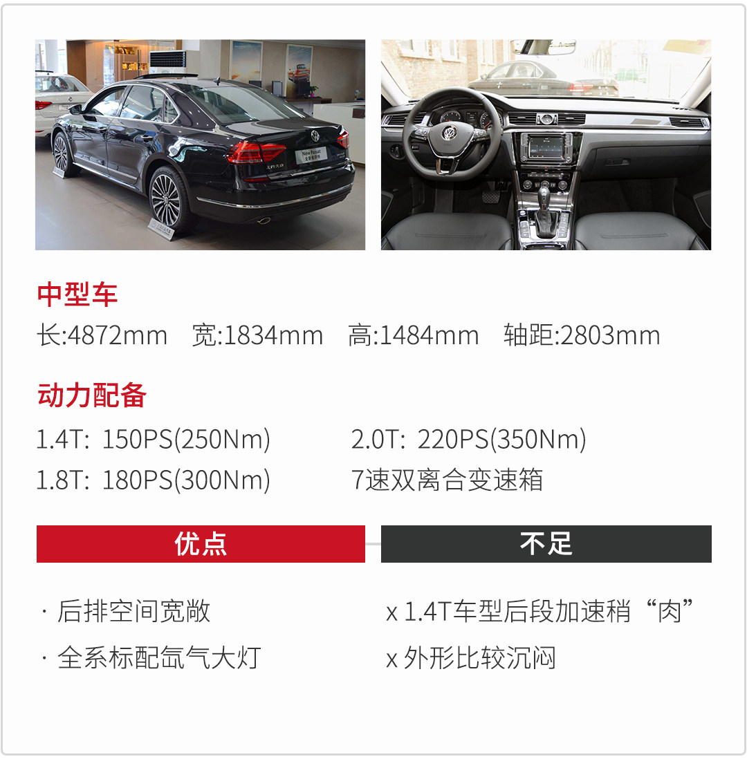 在合资中型车的常青树里,帕萨特从来不会离开这个位置,极强的品牌辨识度,整体造型无论商用还是家用都很适合,“面子工程”做得也非常到位,1.4T、1.8T和2.0T的外观没有显著的差别。动力方面帕萨特有着大众一直给人的亲和力,很容易上手,1.4T的动力对于城市路况也不成问题,当然高速的话还是稍微不够1.8T和2.0T那么强劲。