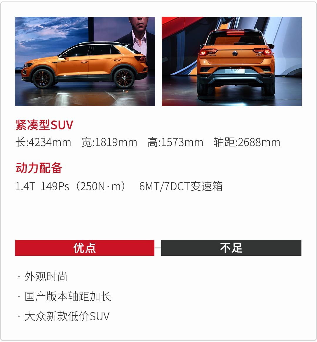 在车身尺寸方面T-Roc并不占优,外观显得小巧,但是进入国内,据闻轴距加长到2688mm,这有利于带来更出色的车内空间表现。大众T-Roc的动力上提供一台1.4T涡轮增压发动机,匹配6MT以及7挡双离合器变速箱,最大输出149马力,峰值扭矩为250牛/米,动力参数上与同级别相比占不了什么优势。