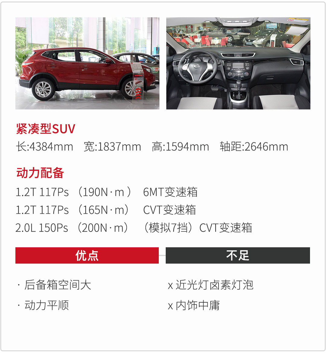 逍客内饰整体布局清晰,但多年的日产风稍显普通,也只有2.0L车型才配7英寸彩色中控屏。逍客中控台大面积覆盖软质材料,摸起来更有质感。拥有较大的后备箱,容积达到486L,日常大件物品也不用愁放不下了。可是逍客全系近光灯都是卤素灯泡,现在LED光源的车比比皆是,卤素灯泡确实寒碜。