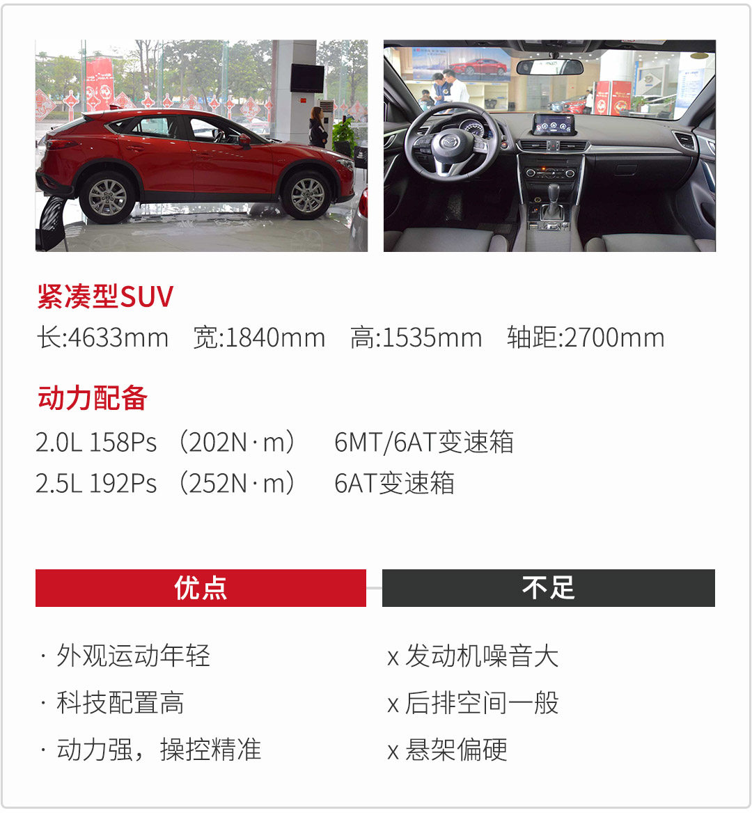 马自达CX-4运用彩色的HUD抬头显示仪,所有的行车信息都反映在上面,驾驶者能更加专注地注视前方的路面状况,中控屏幕显示清晰,界面流畅,方便。可是后排空间表现就一般了,另外马自达ZOOM的概念影响了车内的静谧性,发动机声传进车舱,凸显运动风,却丧失舒适性。