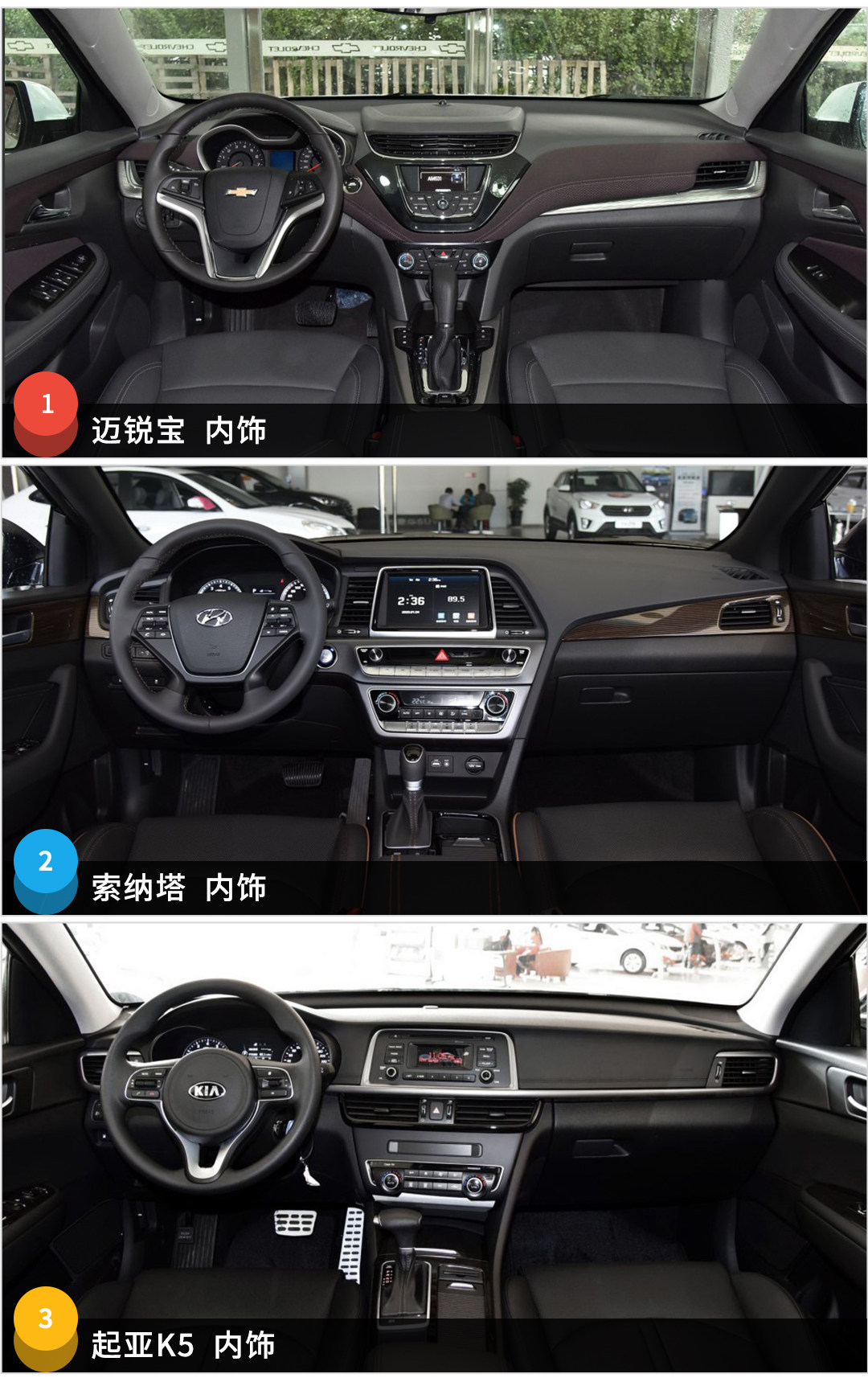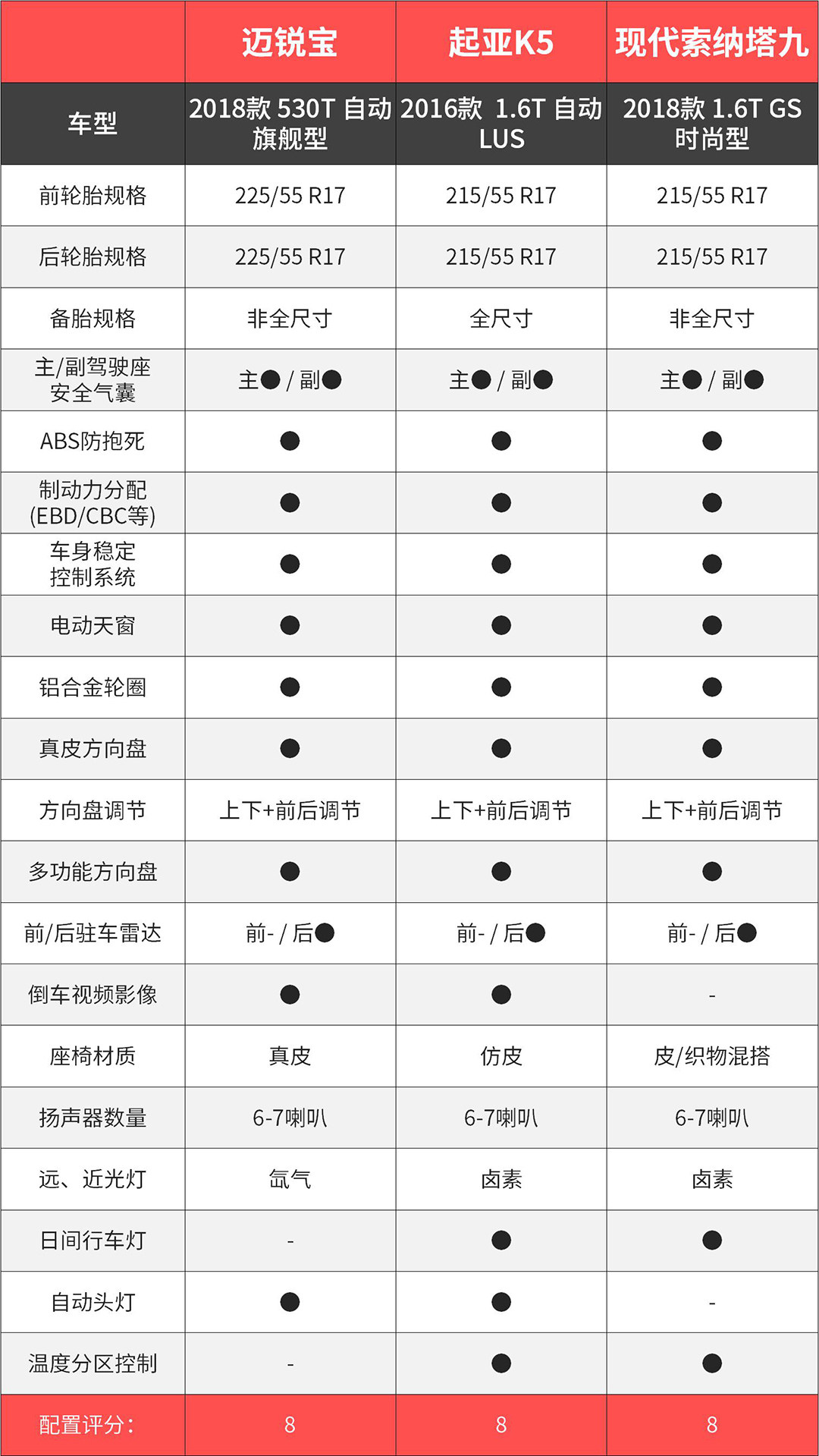 这三款车的性价比高不是没有道理的,看它们的配置可见一斑,教授选取的都是15万这个价位的车型对比。首先该有的主动/被动技术一个都不少,如车身控制、刹车辅助;三辆车方向盘都是真皮的,座椅的材质上迈锐宝要更胜一筹,采用的是真皮座椅,舒适感会强些;1.6T时尚型索纳塔9居然没有倒车影像,感觉少了那么一点诚意。