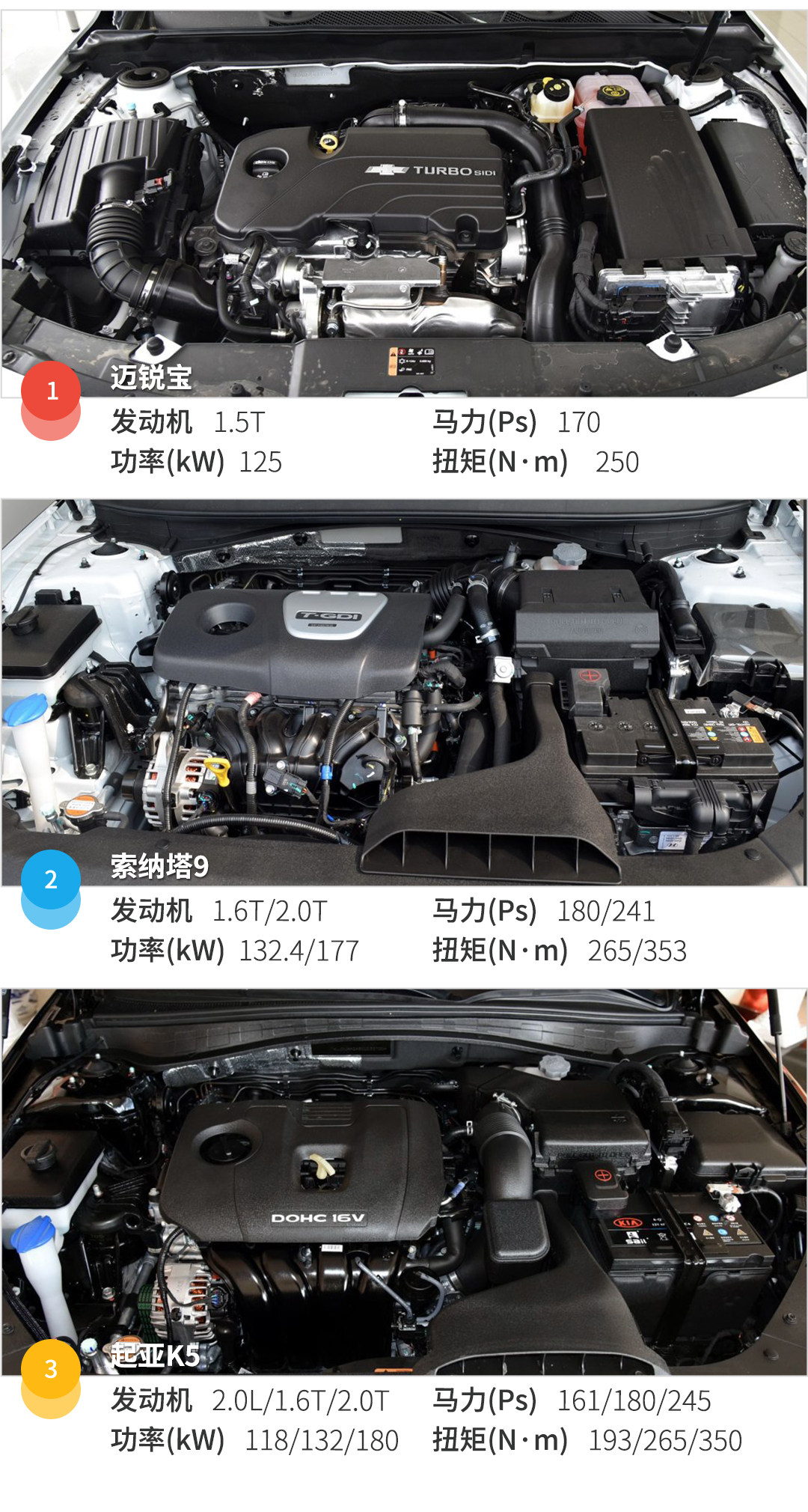 现阶段迈锐宝只有一套动力系统,1.5T的涡轮增压发动机,加上第三代通用的6挡手自一体变速箱,除了换挡平顺性有所升,油门响应比较迅速之外,迈锐宝整体的油耗也维持在一个较低的水平;动力方面索纳塔9采用的是1.6T加七挡双离合,2.0T加6挡手自一体的动力模式,其中2.0T是用来代替2.4L发动机的,其动力储备要比2.4L要好,跟6挡手自一体变速箱的配合在提速方面表现的很平缓,不会有突然爆发的感觉;除了时尚年轻的外观这一卖点外,起亚K5不错的动力也是很多车主选择它的原因,2.0T车型的百公里加速达到了7秒多,相比同样是韩系索纳塔9的2.0T发动机,爆发力强了那么一点。并且提供三种动力,选择比较丰富。灵敏的油门响应和双离合较快的换挡响应,带来比较猛的提速体验,在大部分情况下,不用担心自己的车被超过而无能为力。