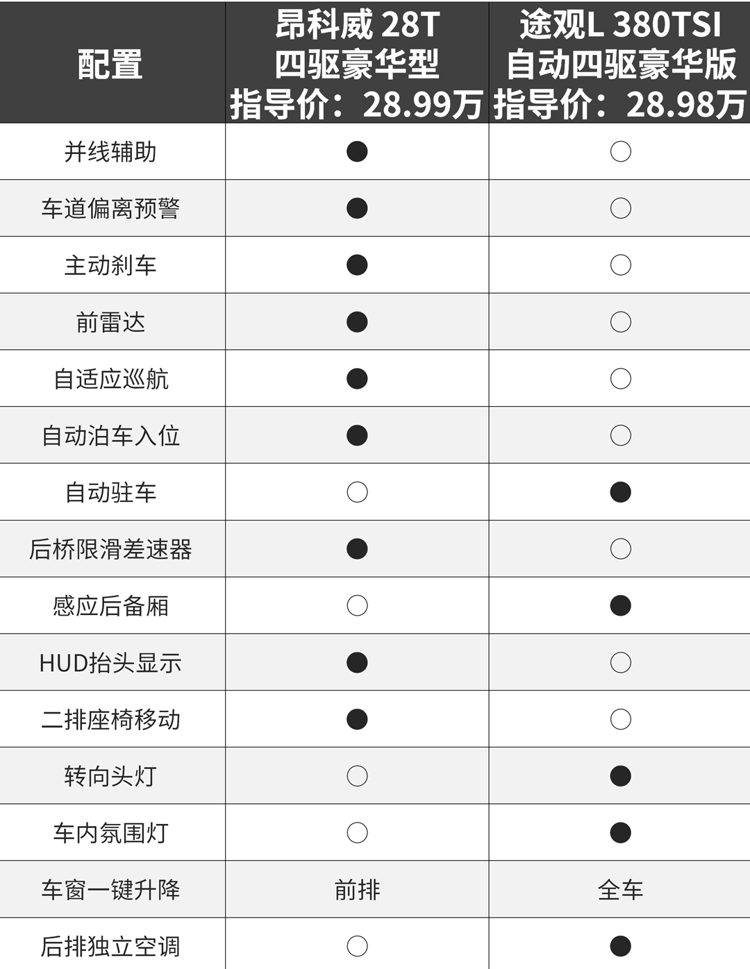 配置上来看,途观L基本处于劣势,但也有一些配置颇为实用。例如全车车窗的一键升降,这就比昂科威要厚道许多。同时,还有后排独立空调。途观L的全时四驱系统在应付一些较为极端的路况时,表现得要比昂科威的适时四驱系统更为从容。