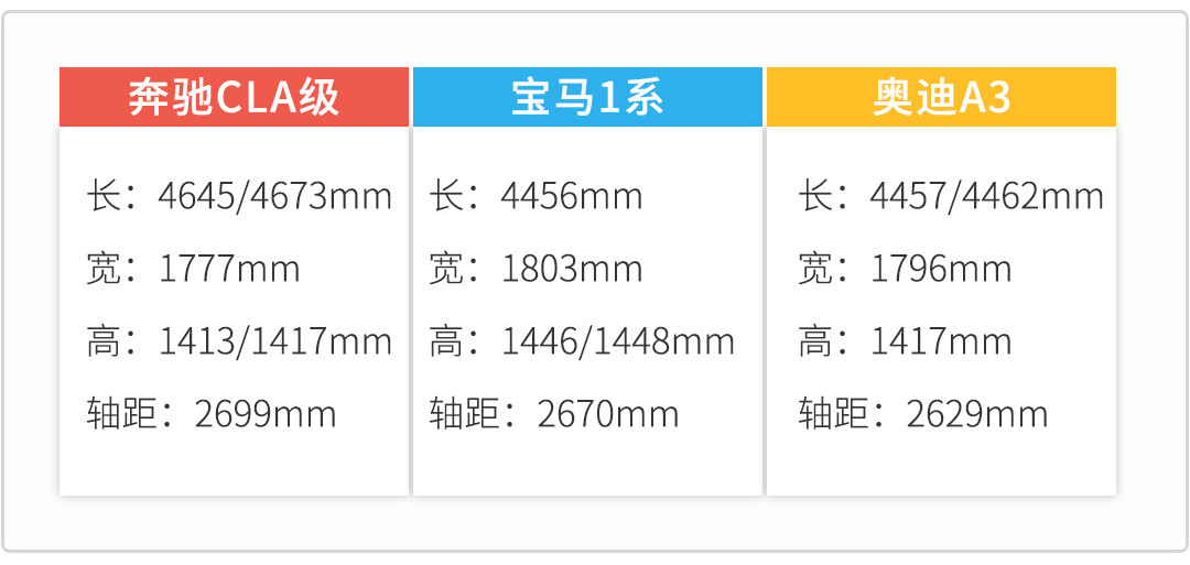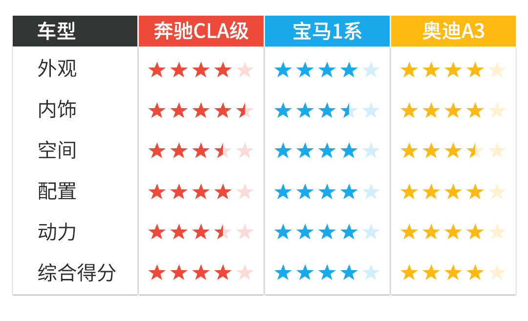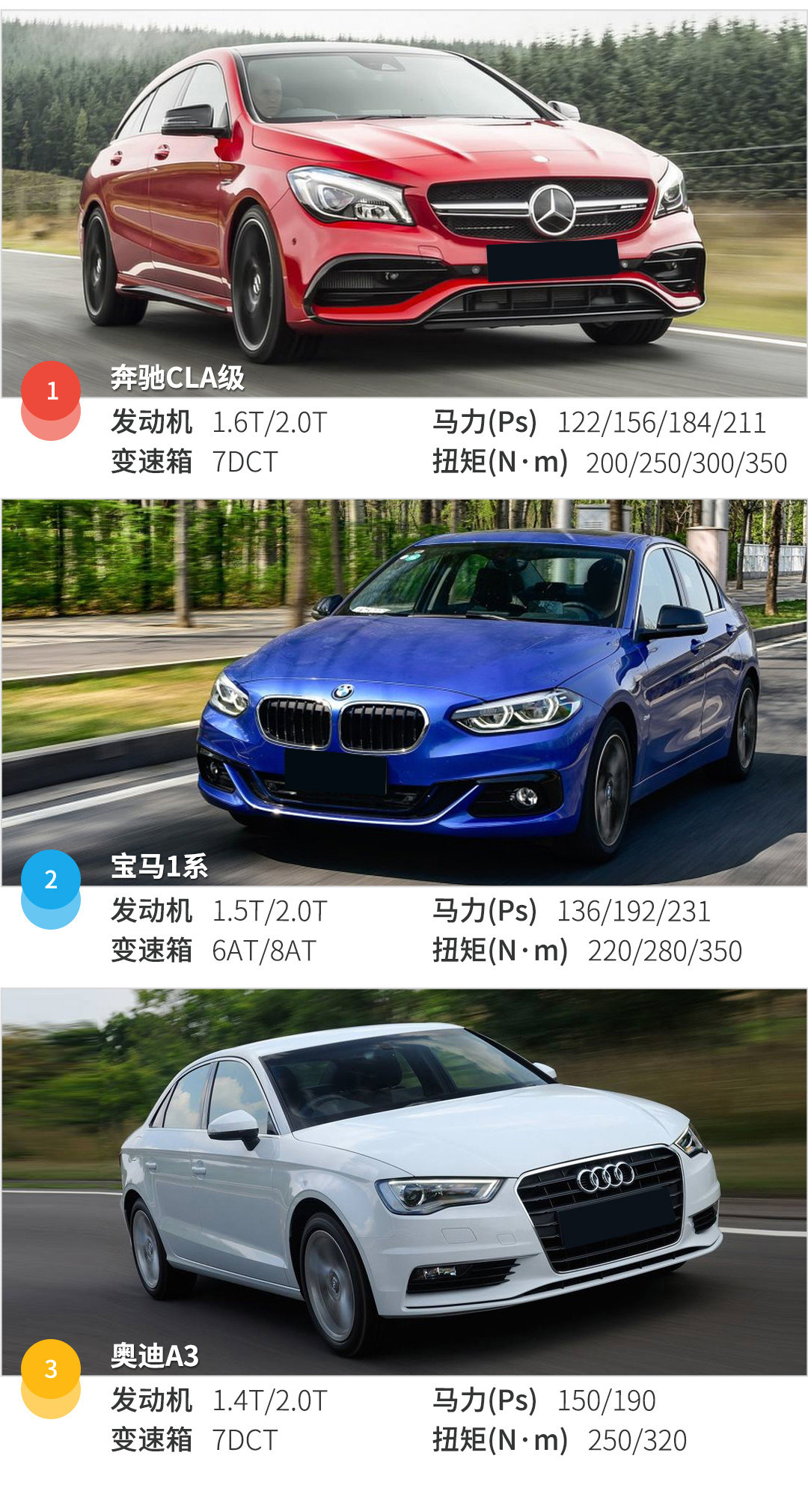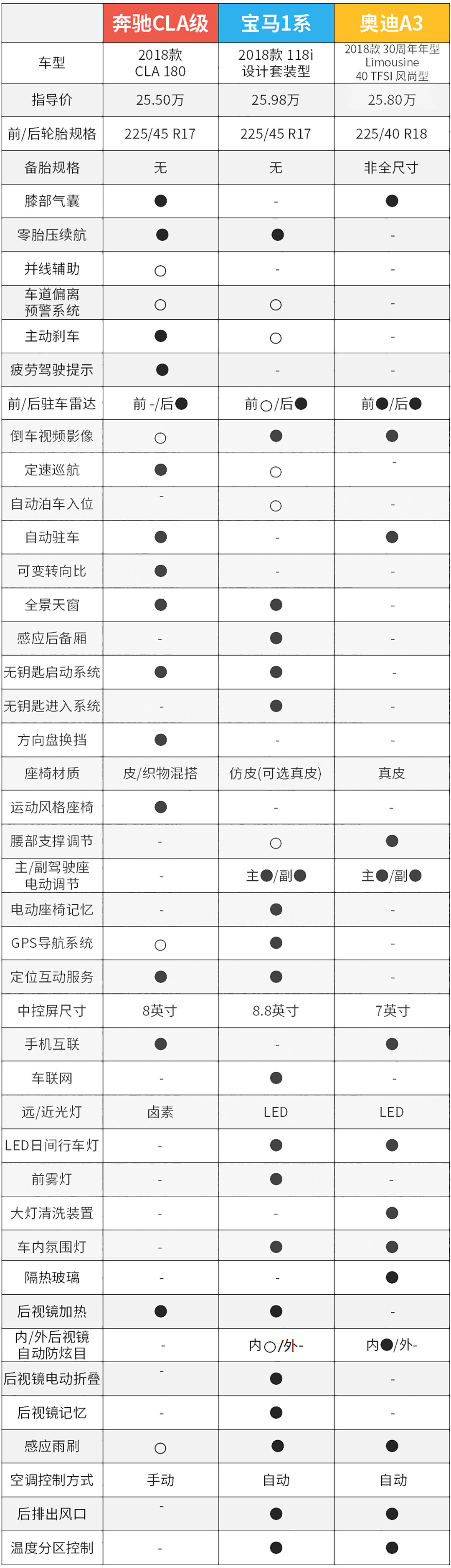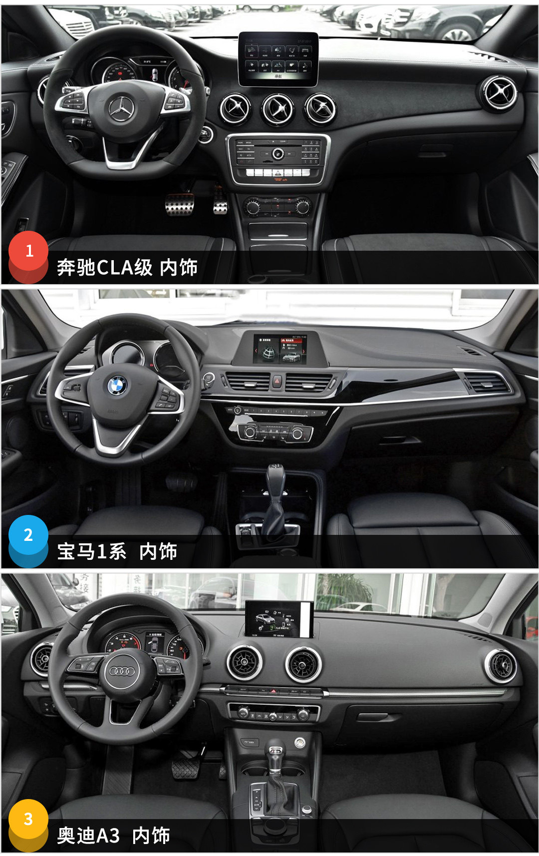 从以上车型的配置差异来看,可以看出三款车型各自的倾向有所不同,奔驰CLA更注重安全配置,宝马1系更注重一些实用的功能配置,而奥迪A3更注重一些...灯光设备...(好吧,奥迪A3在配置方面似乎真的没什么优势)。但由于各地各车型的终端优惠有所差异,所以以上对比仅供参考,具体谁的配置更丰富,还需针对更具体的购车预算进行对比。
