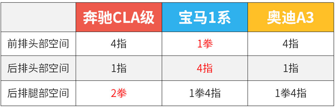 我们列出了此前统计出来的实测数据进行对比,1.78米的试乘员以常规的测量方式分别对于三款车型进行实测,在表格中我们可以看出,这三款车的实际表现跟我们预想的一样,奔驰CLA的腿部空间更有优势,宝马1系的头部空间更有优势,其中奥迪A3的实测车型为三厢版车型。