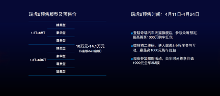 瑞虎8将于4月25日北京车展正式上市,首批全平台预购活动现已开启。即日起至4月25日上市期间,购买瑞虎8可享受专属预购权益:登录奇瑞汽车天猫旗舰店参与众筹预定或扫描瑞虎8小程序二维码参与互动,可最高尊享1000元购车红包。即刻参与预购活动,交车时另尊享价值1999元全车3M膜。
