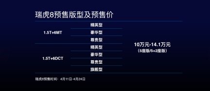 2018年4月11日,北京。“Fun 2 X 智·联万物”奇瑞智能品牌发布会,备受瞩目的奇瑞全新SUV——瑞虎8正式开启预售。提供三种版型以及1.5T/6MT与1.5T/DCT两种动力总成配置,预售价格区间10万元-14.1万元。此外,瑞虎8全系车型还将在5座基础上,提供“5+2”座椅升级布局供消费者多元化选择。