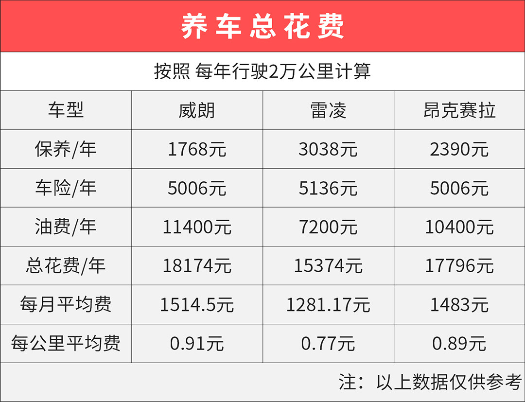 从表格的数据来看,在后期的保养当中,三款车的5000-10000公里的保养项目基本相同。而从保养费来看,威朗行驶2万公里做保养所需要的花费最少,零配件的价格也相对要实惠不少,另外一个角度来看,威朗所用的零配件的使用寿命也更长。