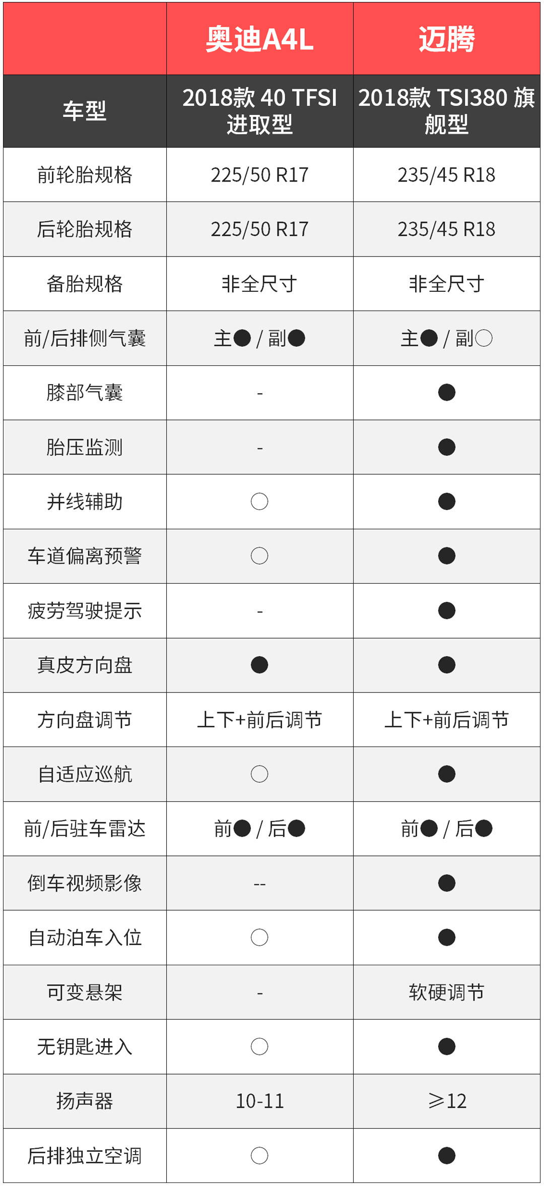 虽然用武装到牙齿来形容迈腾的配置有些夸张,但是也相差无几了吧。教授摒弃了一些常规的配置,带大家来看一些比较陌生的名字。首先,迈腾的安全系数高,后排侧面和膝部都有安全气囊保护,气囊数足够多。并线辅助、车道偏离预警等配置并不常见,这些辅助功能可以让你在驾驶过程中更加安全。还有非常人性化的配置——疲劳驾驶提示,妈妈再也不用担心我疲劳驾驶了。反观奥迪A4L,这些配置只可以选装,跟迈腾相差还是挺大的。如果你是个配置控,相信看到这里就不难决定该买哪一辆了。