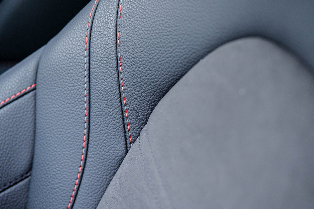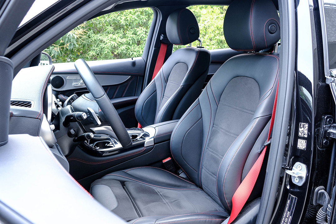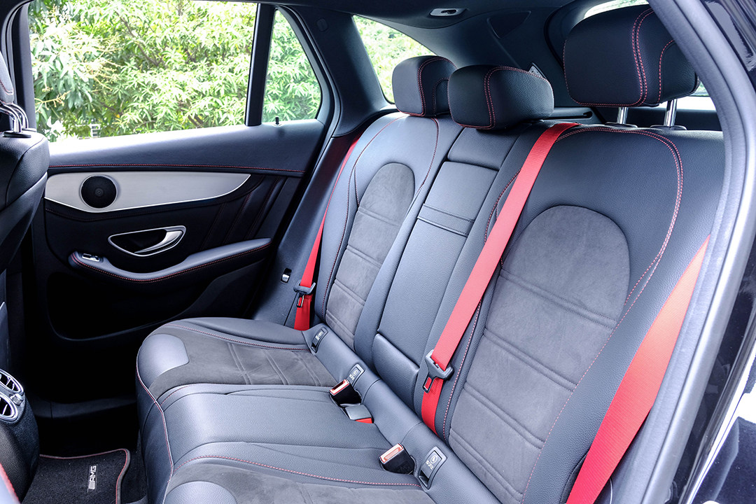 体验完了GLC43最值钱的发动机部分,现在调翻Comfort模式,才有机会好好体会一下内饰。说实在的,GLC43的内饰一点也不AMG。我们这次试驾的是入门版的glc43,可以看到仪表标底多了写格仔,方向盘换了个平底方向盘,安全带变成红色,座椅造型是和普通版的GLC完全一样,只是多了些红色的缝线,和换了些alcantara的材质,后排坐垫多了些凸起,that is it!